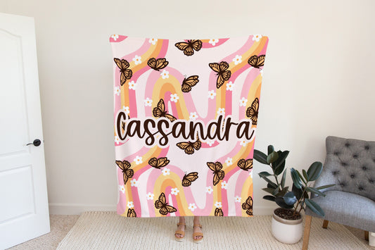 Personalized Pink Blanket groovy butterfly design, housewarming gift for her, butterfly lover gift, baby shower gift blanket