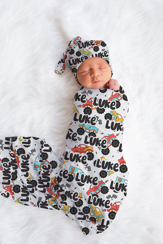 Baby Boy Swaddle Blanket Hat Set, trucks swaddle, hospital reveal outfit baby boy, baby shower gift, receiving blanket for boys