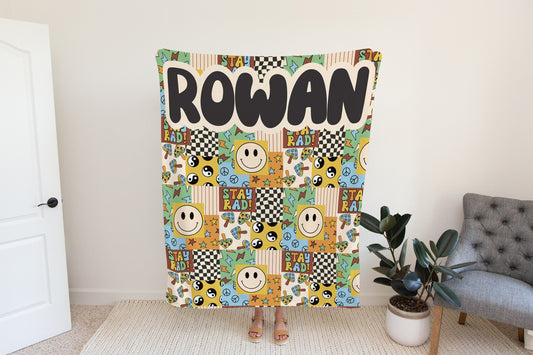 Personalized blanket for boys, Smiley face blanket, checkered throw, birthday gift for him, custom name baby blanket, baby shower gift