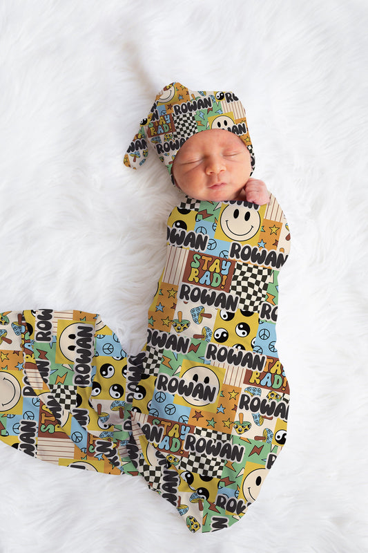 Baby Boy Swaddle Blanket Hat Set, smiley swaddle, retro hospital reveal outfit baby boy, baby shower gift, receiving blanket for boys