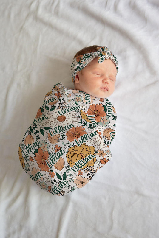 Custom Floral Baby Swaddle Blanket newborn boho, coming home hospital announcement reveal outfit, personalized name blanket baby shower gift
