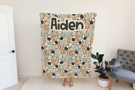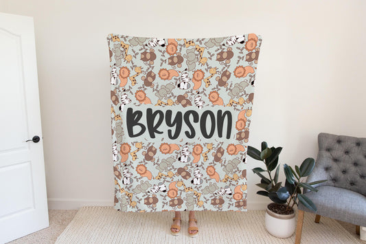 Personalized blanket for boys, safari animal blanket zoo theme, unisex birthday gift for him, custom name baby blanket baby shower gift