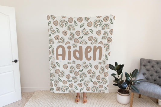 Lion Personalized blanket for boys, rainbow sage green neutral blanket, unisex birthday gift for him, custom name baby blanket baby shower