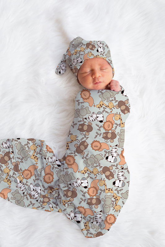 Personalized Baby Boy Swaddle Blanket Hat Set, safari swaddle, animal hospital reveal outfit unisex baby shower gift receiving blanket