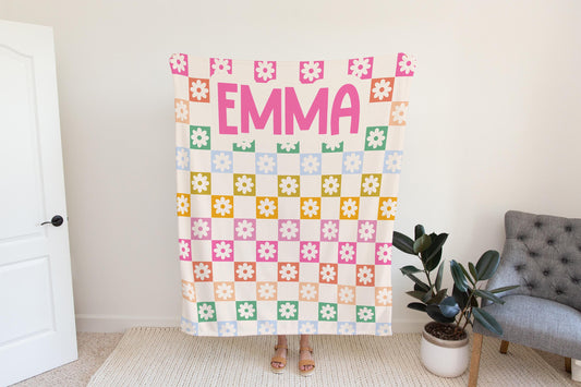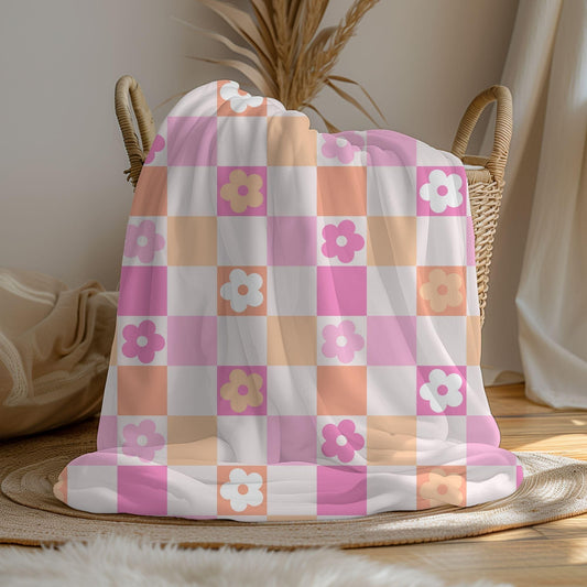 Checkered floral personalized pink blanket, Custom name blanket gift, Birthday Anniversary Gift for her, floral baby blanket