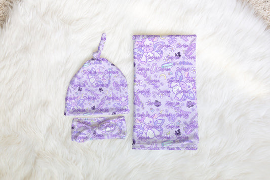 Personalized Purple Swaddle Set Bow Hat Baby Blanket