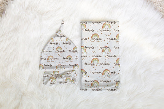 Personalized Swaddle Hat Set Rainbow Baby Blanket