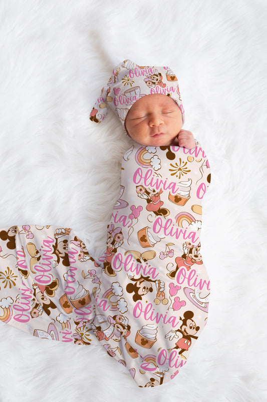 Personalized Disney Swaddle set, Newborn girl hospital reveal outfit, disney baby shower gift, pink disney swaddle bow and hat set