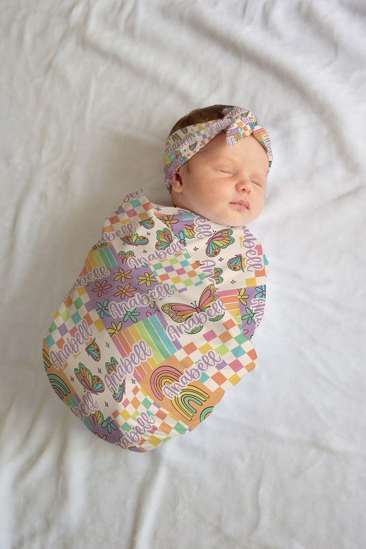 Personalized Butterfly Swaddle bow set newborn patchwork Swaddle and hat set girl hospital reveal outfit baby shower gift stretchy swaddle