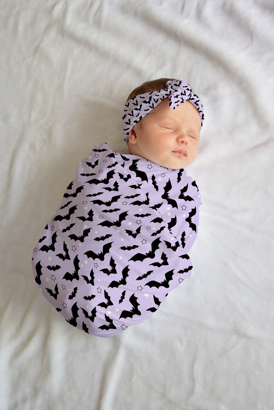 Personalized fall bats Newborn Swaddle Set, purple halloween Swaddle Bow Set, Fall Swaddle Hat set, Custom name Newborn announcement outfit