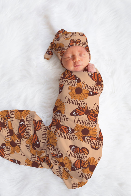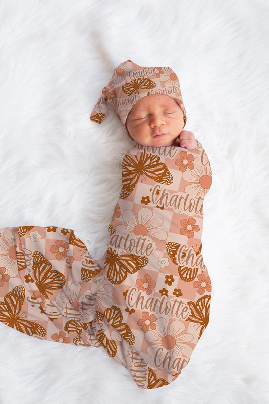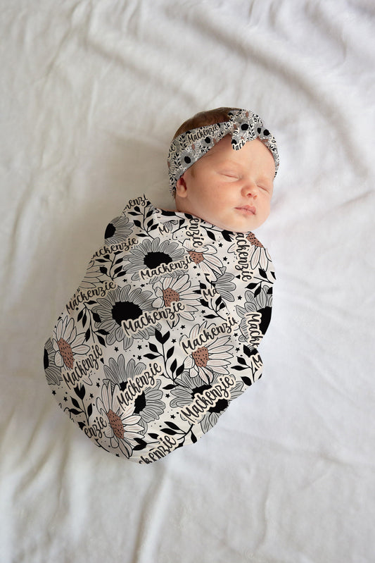 Personalized Swaddle Hat Set Bow Boho Floral Baby Blanket