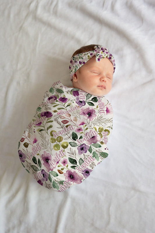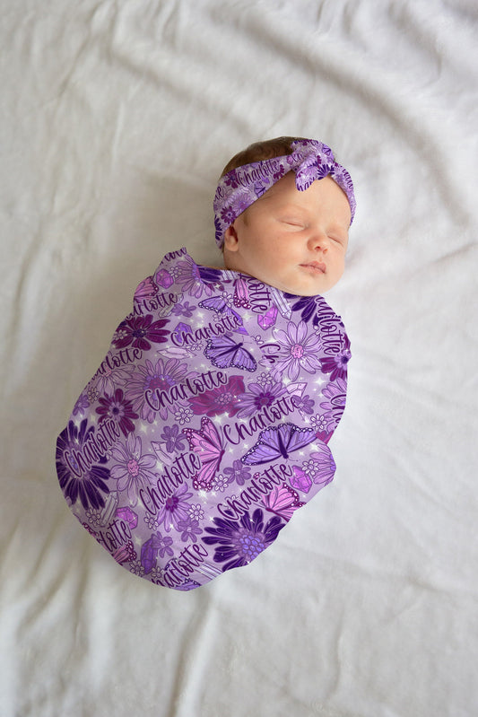Personalized Purple Swaddle Set Bow Hat Baby Blanket