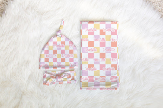 Personalized Pastel Checkered Baby Swaddle Hat Bow Set