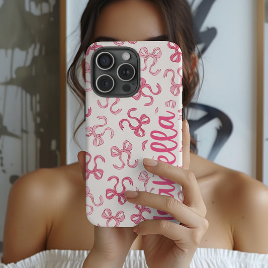 Custom Pink Bow phone case iphone 16, 15, 14, 13 Pro Max, MAGSAFE tough Iphone case coquette, preppy personalized phone case trendy girly
