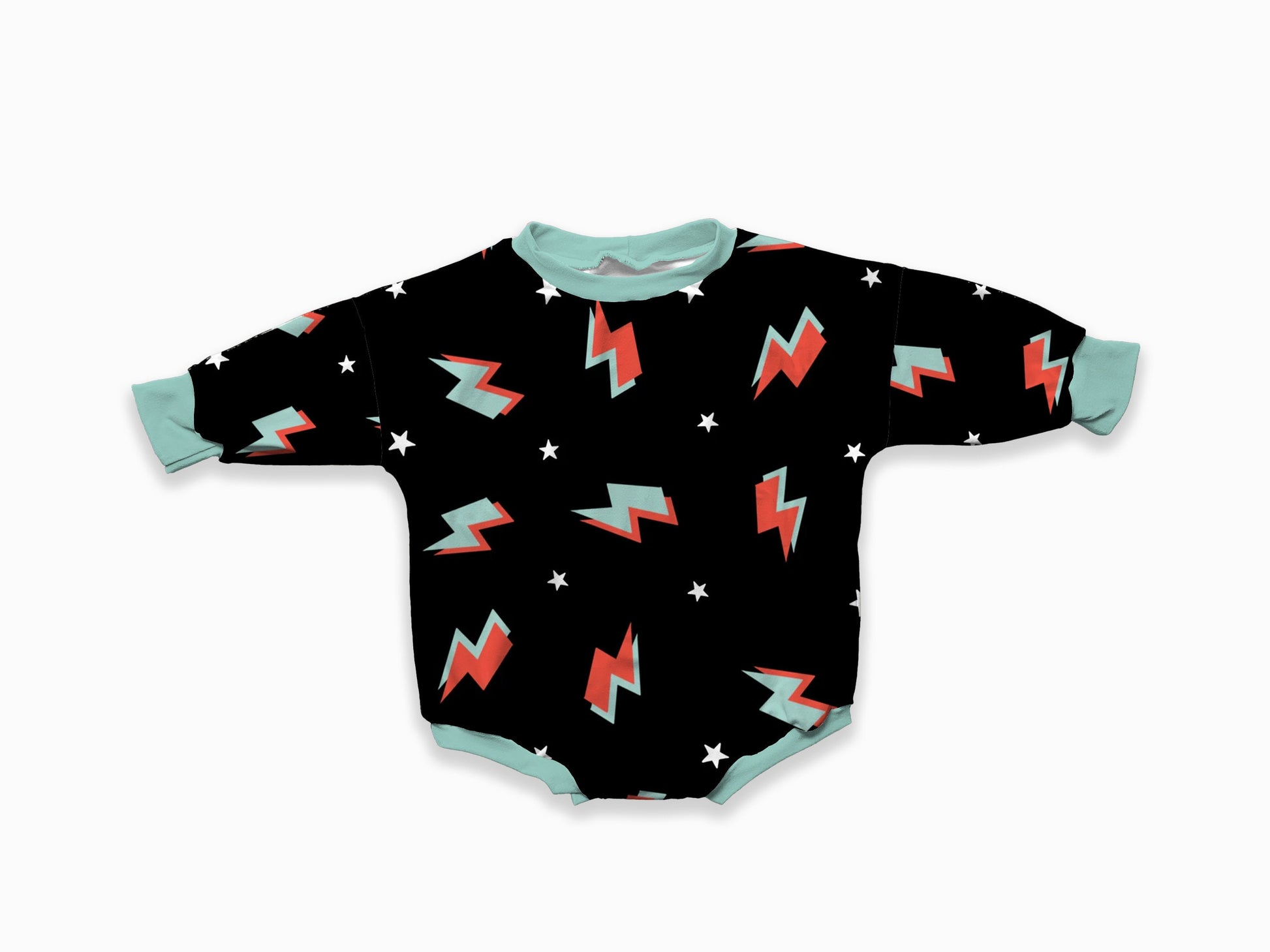 Featuring a striking lightning bolt design on a classic black background, this romper adds a touch of coolness to any outfit. Whether they're playing at home or out on autumn adventures, this romper is both practical and fashionable.