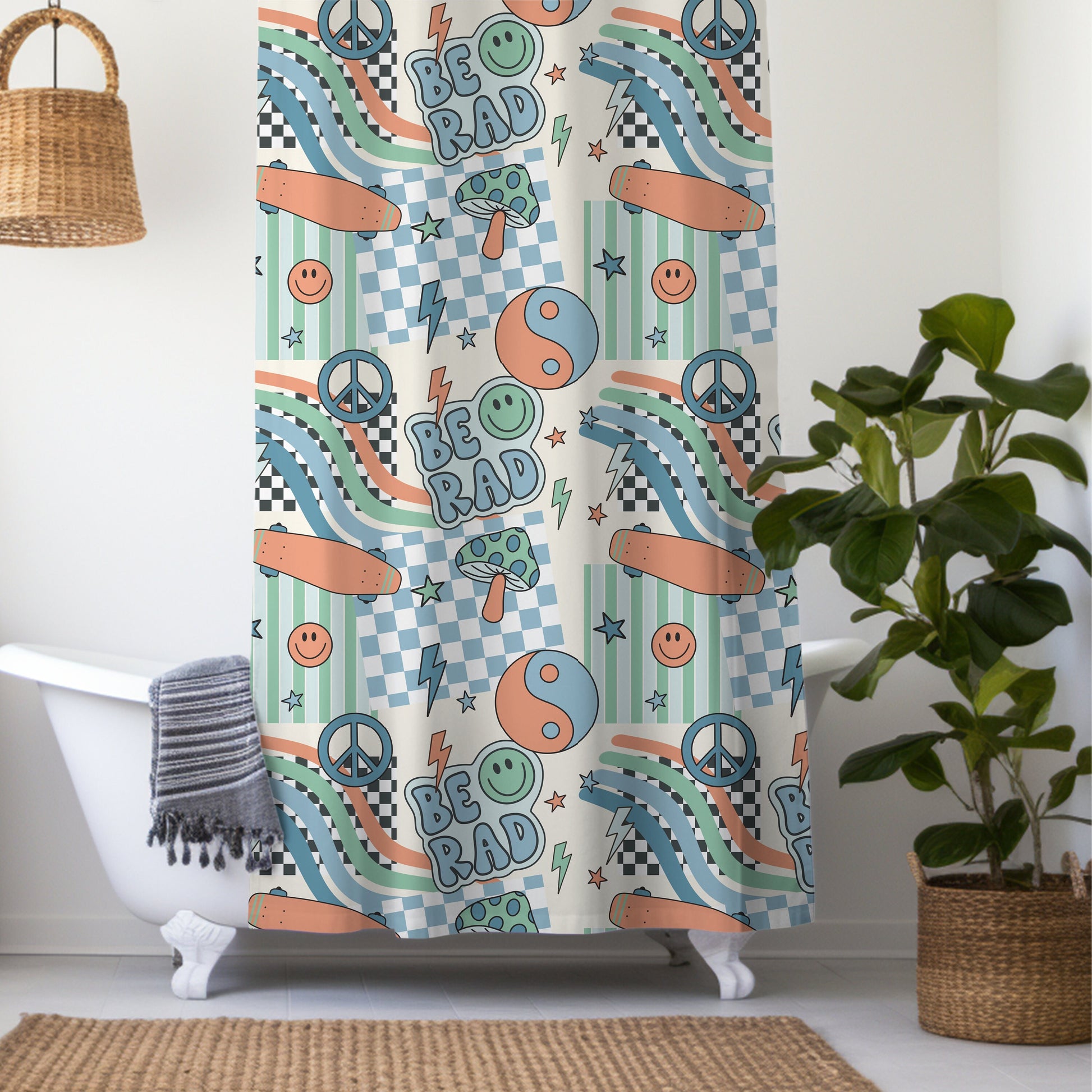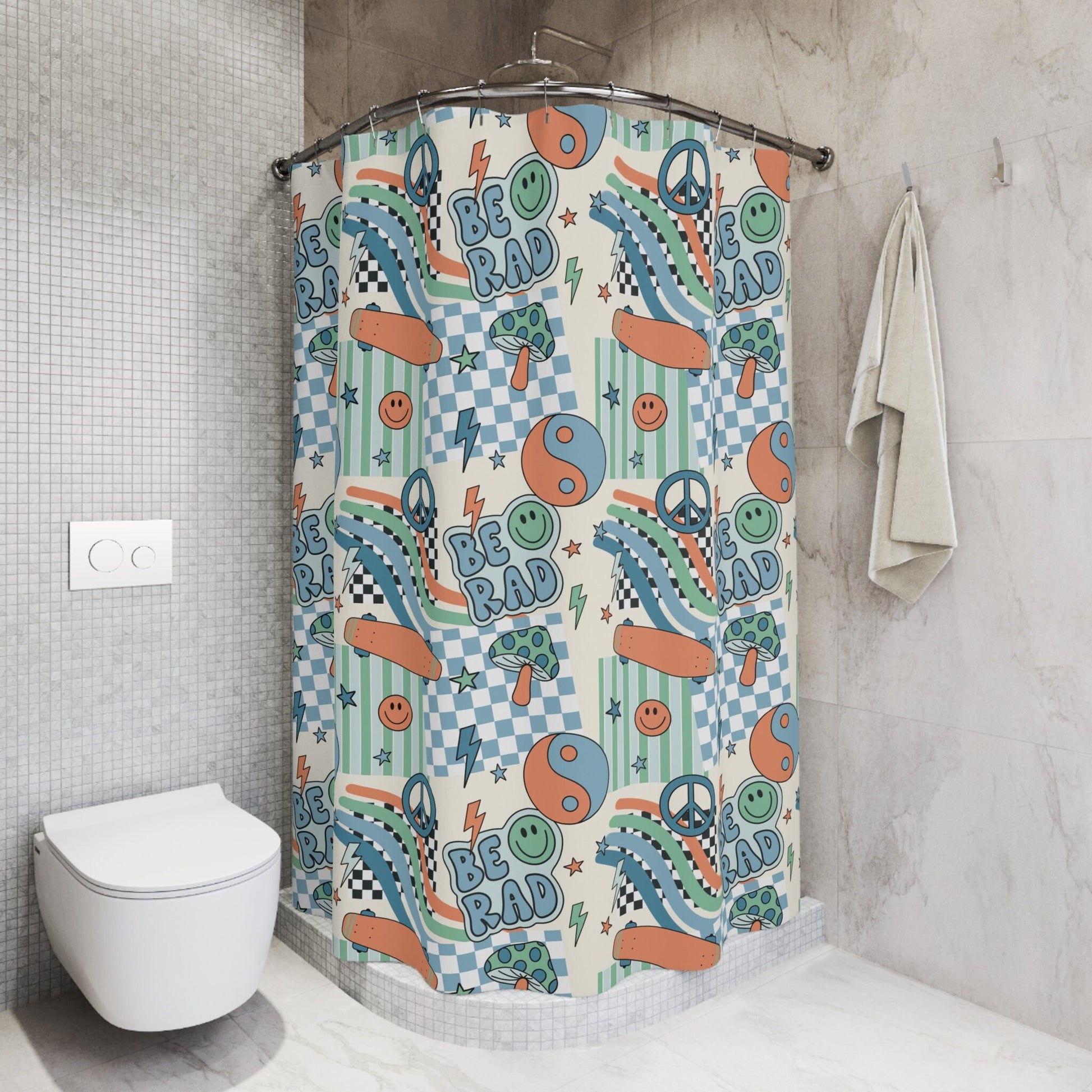 Ideal for updating your kids‘ bathroom decor or as a thoughtful gift, this custom shower curtain is both practical and stylish. Its versatile design complements various decor styles, making it a timeless piece that your child will enjoy for years to come. Enhance your home with this delightful and personalized bathroom accessory that combines charm, functionality, and a touch of retro flair.