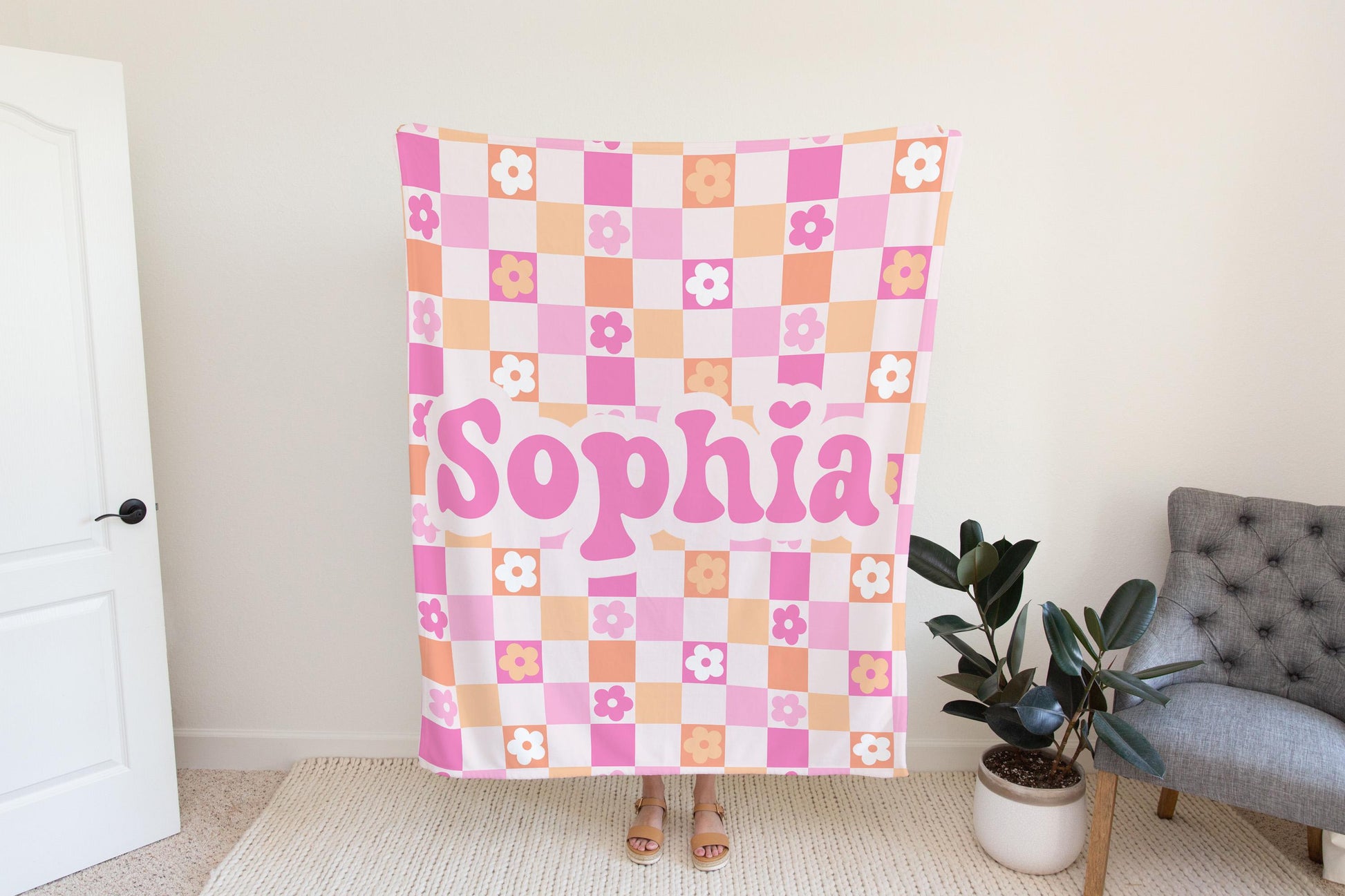 Checkered floral personalized pink blanket, Custom name blanket gift, Birthday Anniversary Gift for her, floral baby blanket