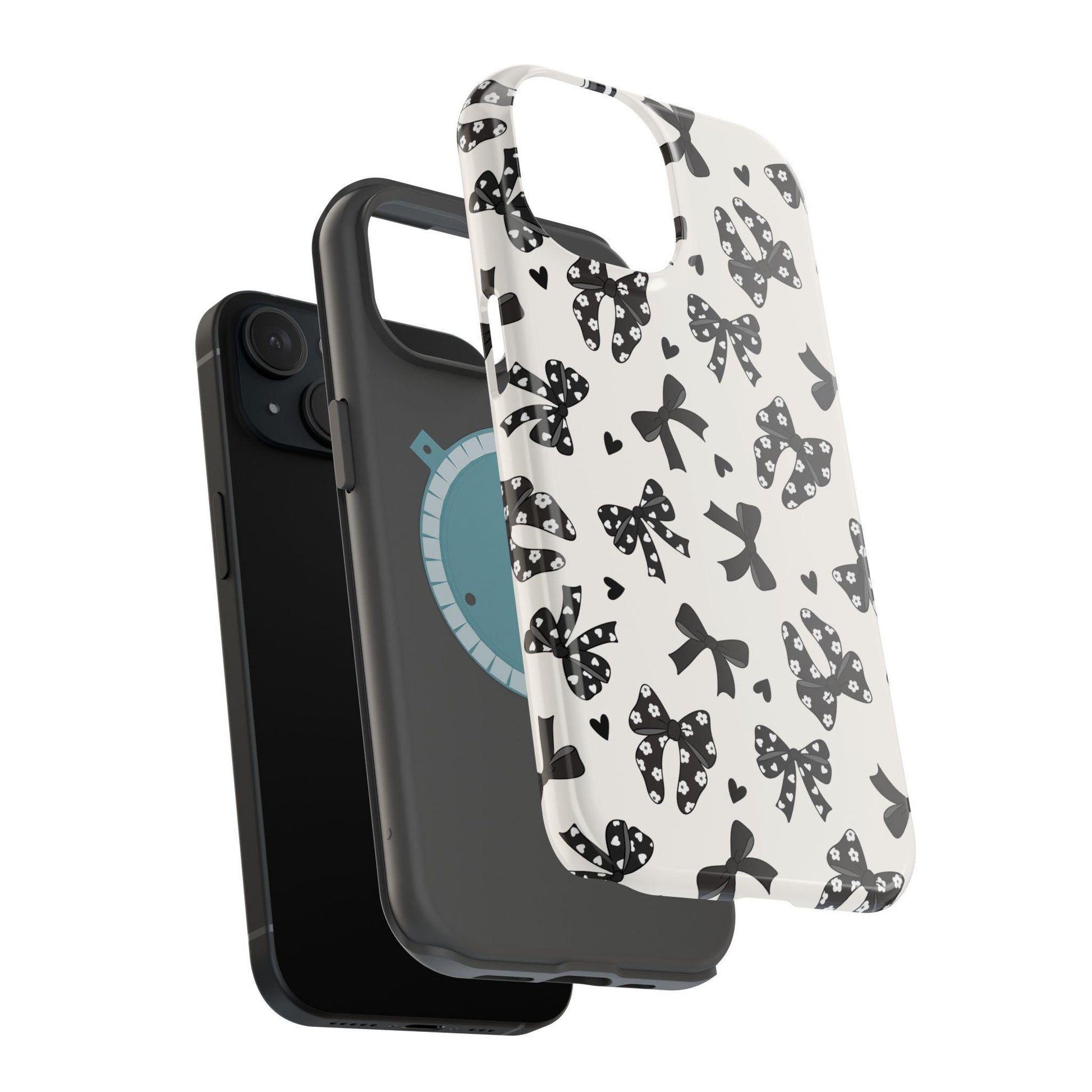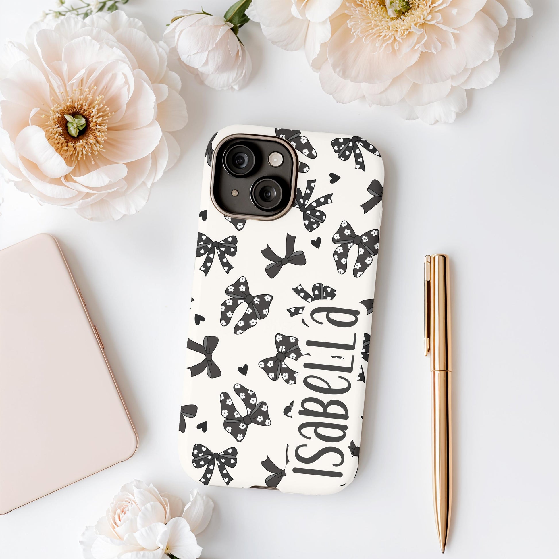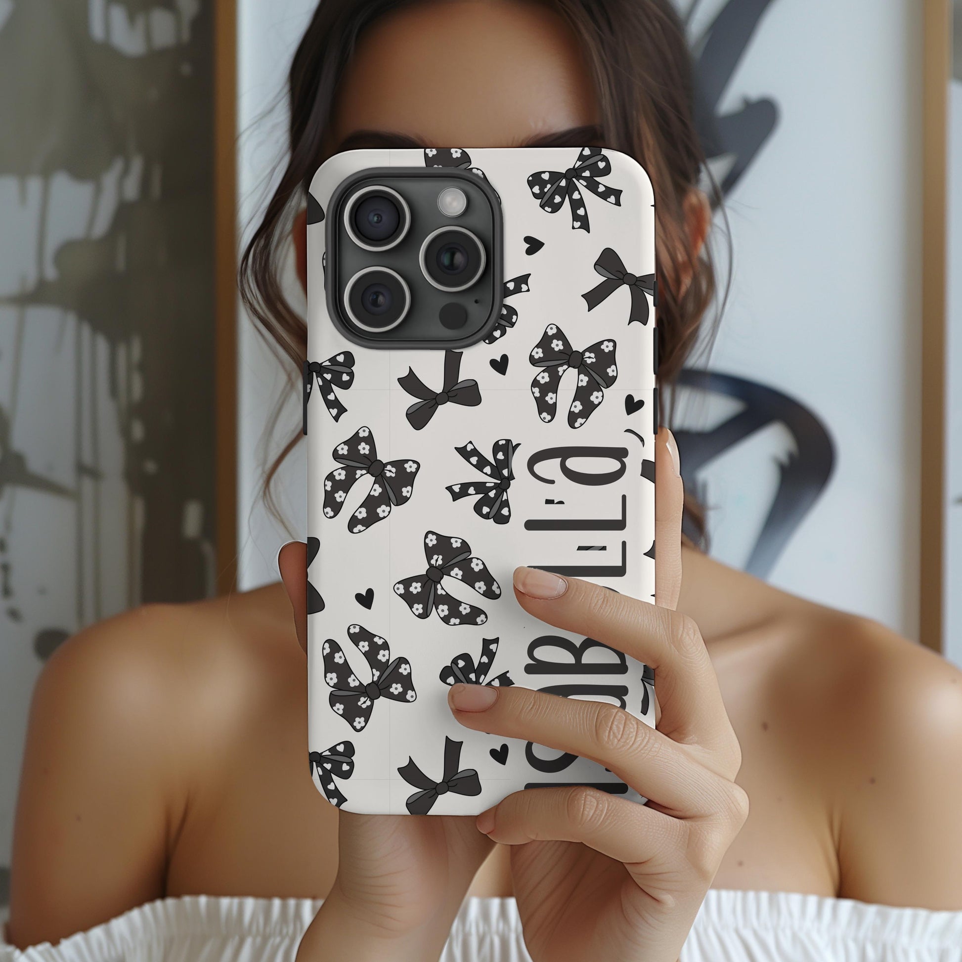 Custom black bow phone case iphone 16, 15, 14, 13 Pro Max, MAGSAFE Iphone case coquette, TOUGH Vintage black cream personalized phone case