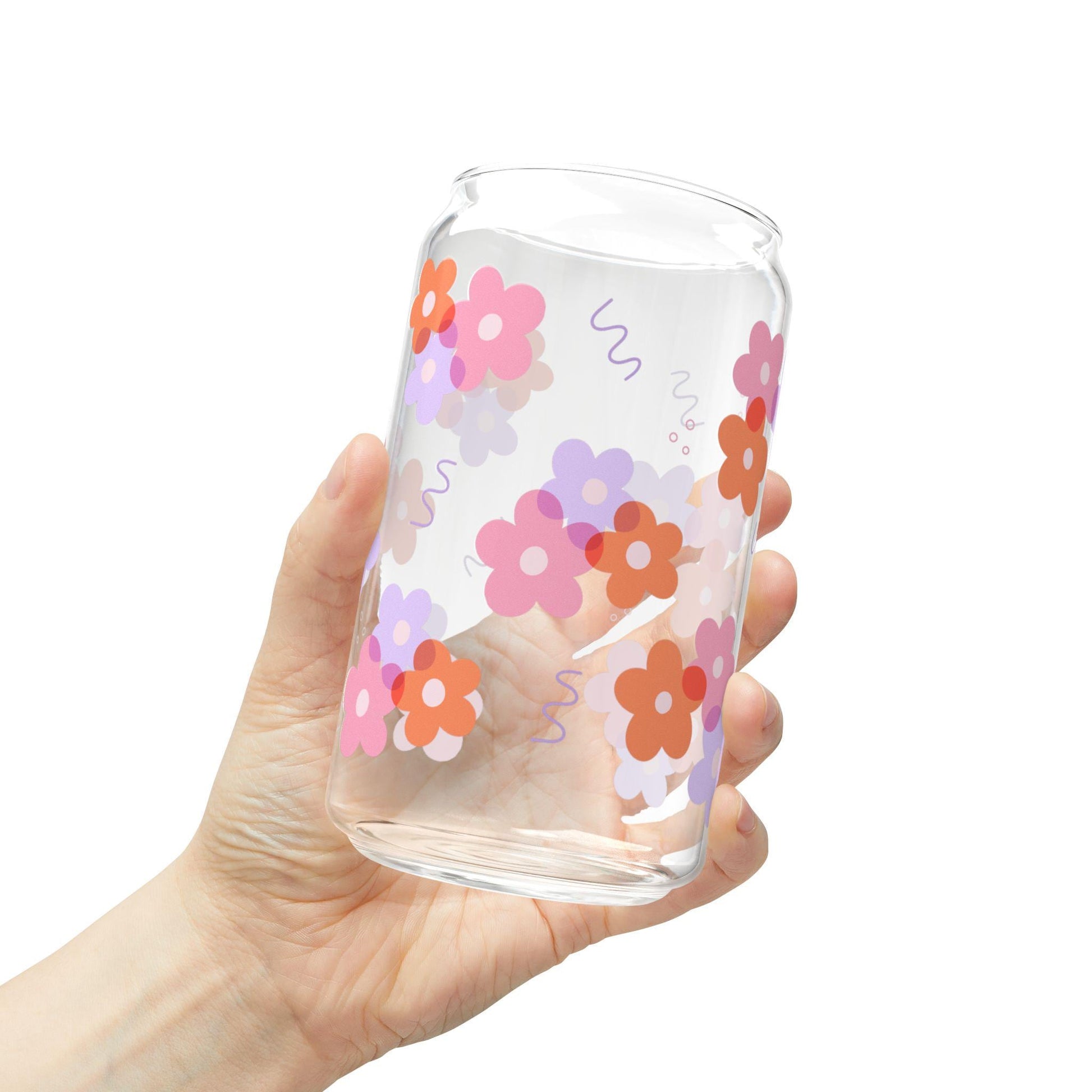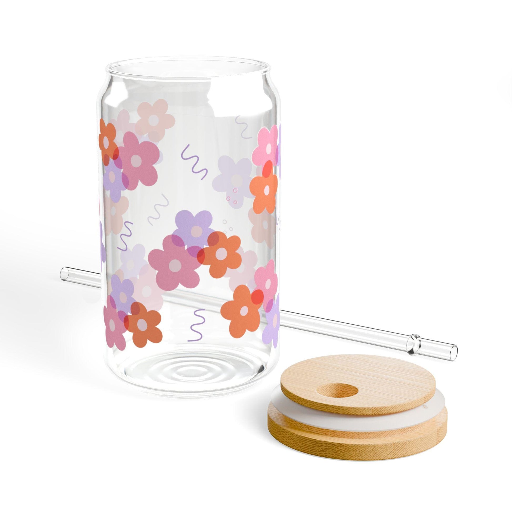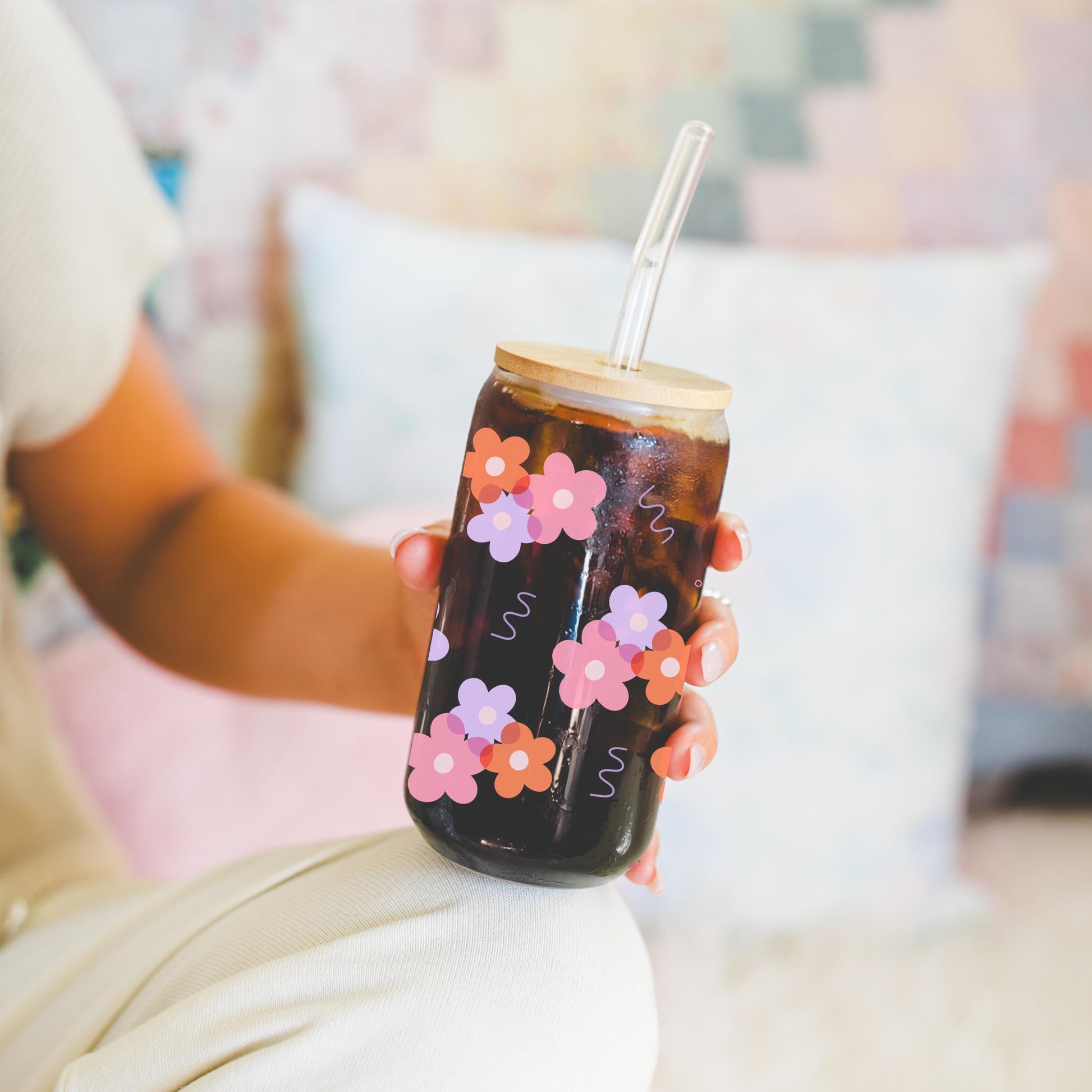 Girly Floral glass cup with bamboo lid glass straw, Cute Cup Beer Can Iced Coffee Glass Cup Cute funny Glass Cup gift for her