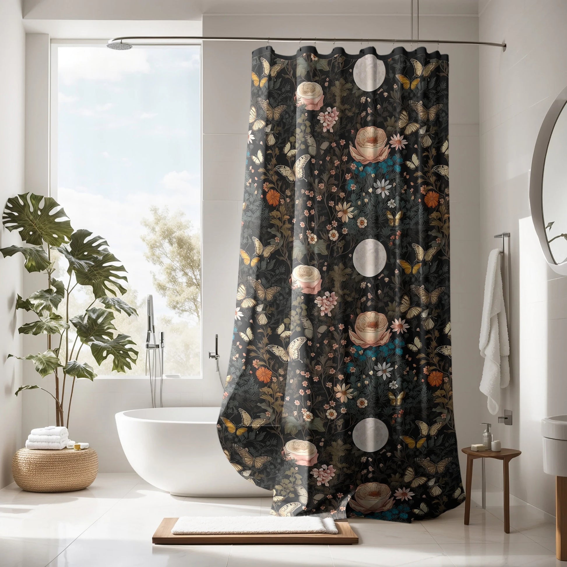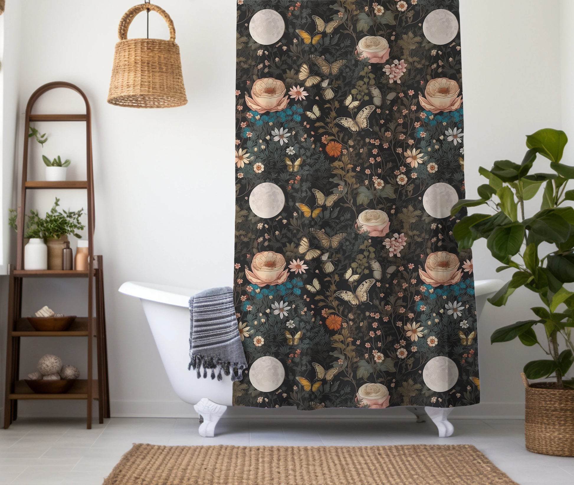 Embrace the magic with this captivating Dark Cottagecore shower curtain. A mesmerizing blend of moody florals and witchy charm, this unique piece will transform your bathroom into a haven for the modern mystic.