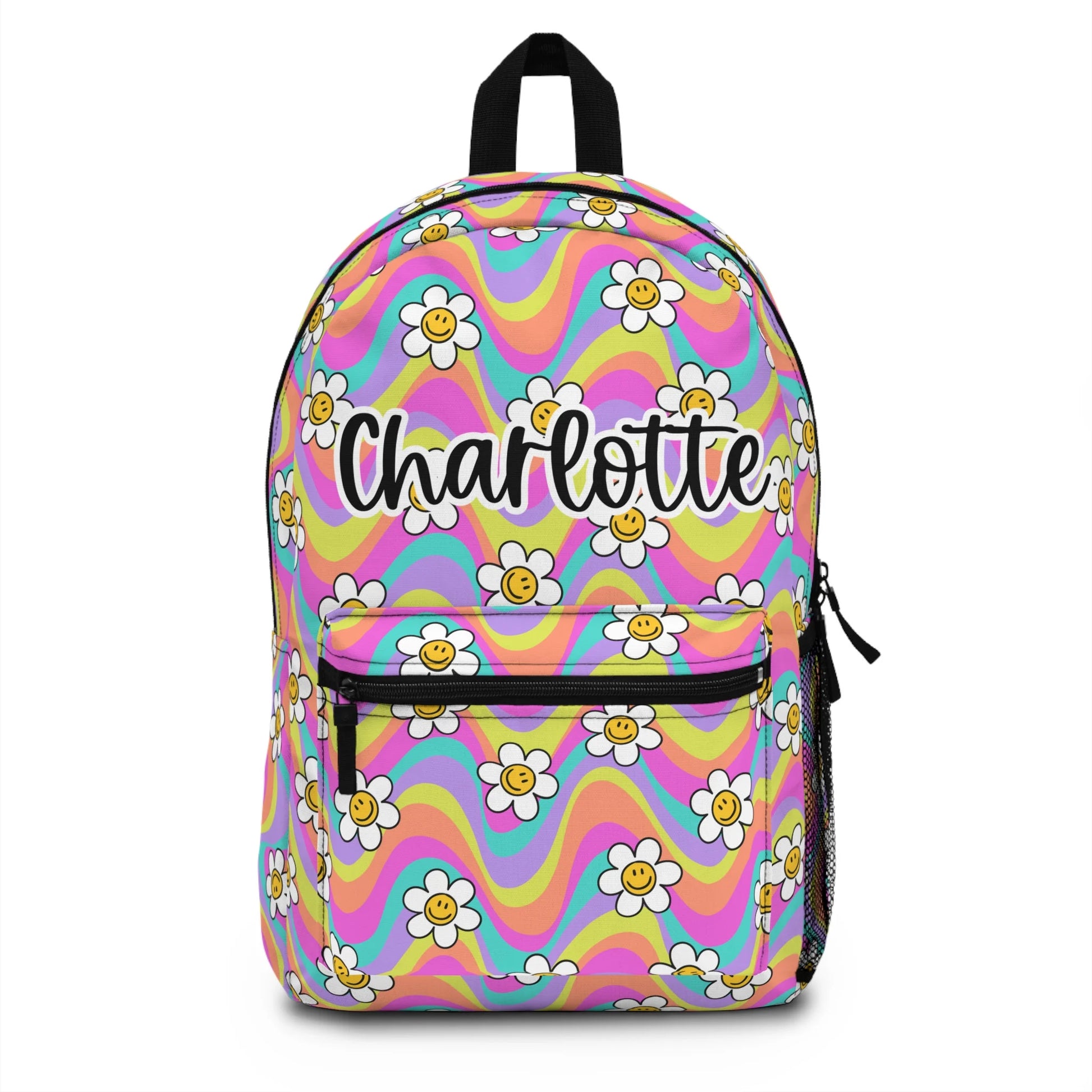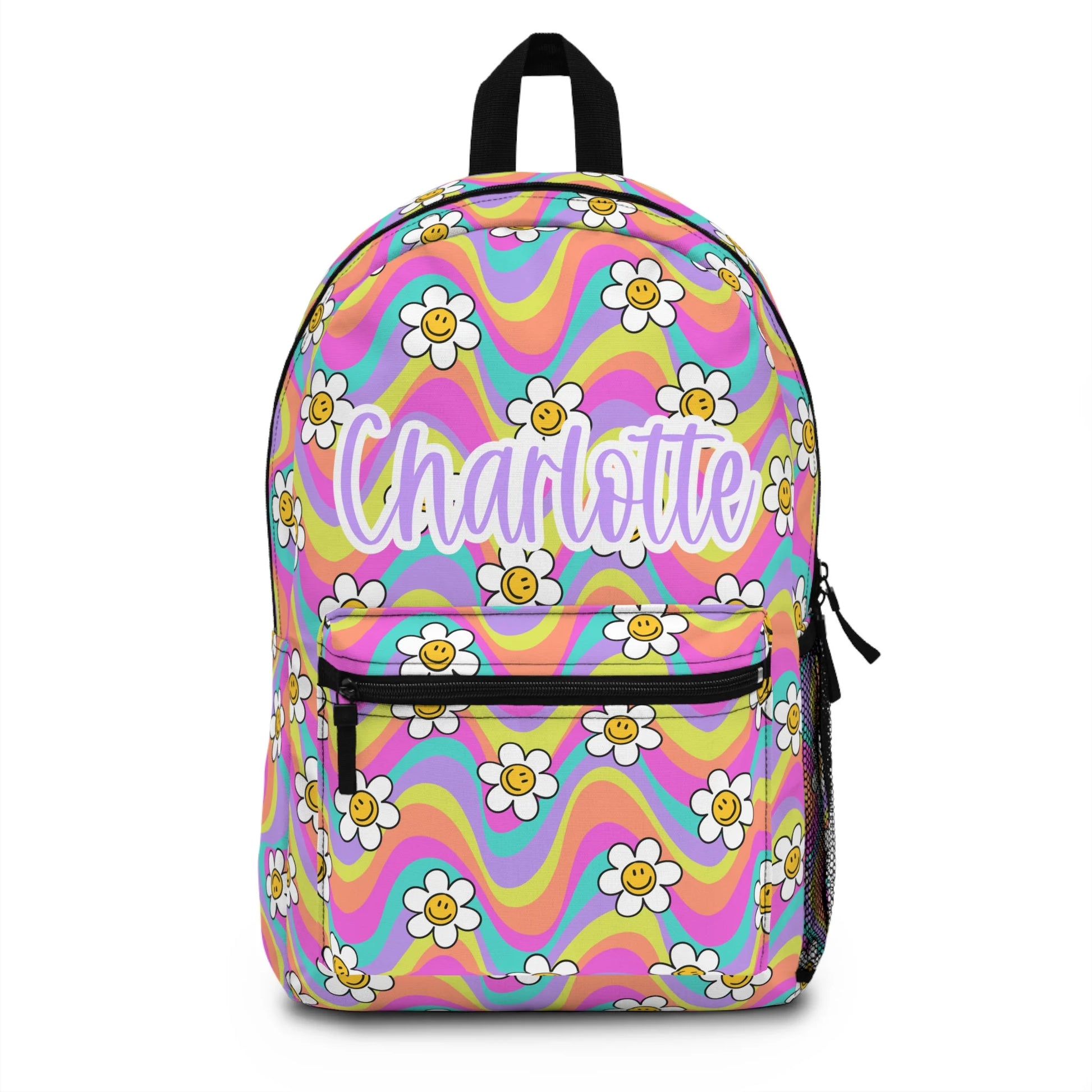 Our personalized floral groovy backpack combines functionality with fashion. The vibrant and playful floral design brings a groovy touch, ensuring your little one stands out. Made from high-quality, durable materials, this backpack is built to withstand the rigors of daily use while providing comfort with its adjustable padded straps and back panel.
