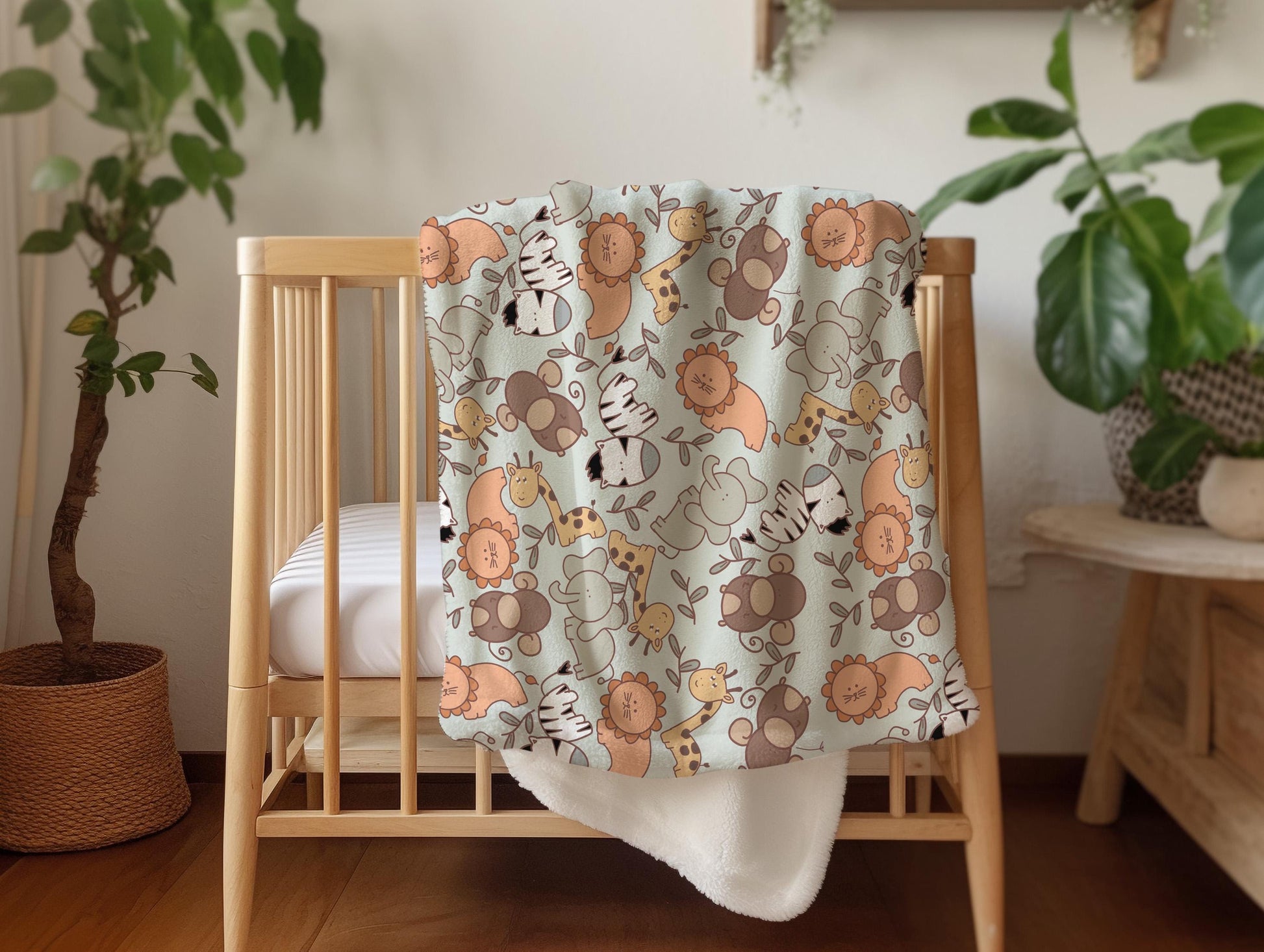 Safari Adventure Design: Cute zoo animals like lions, elephants, and giraffes bring a fun and playful vibe to the blanket.
