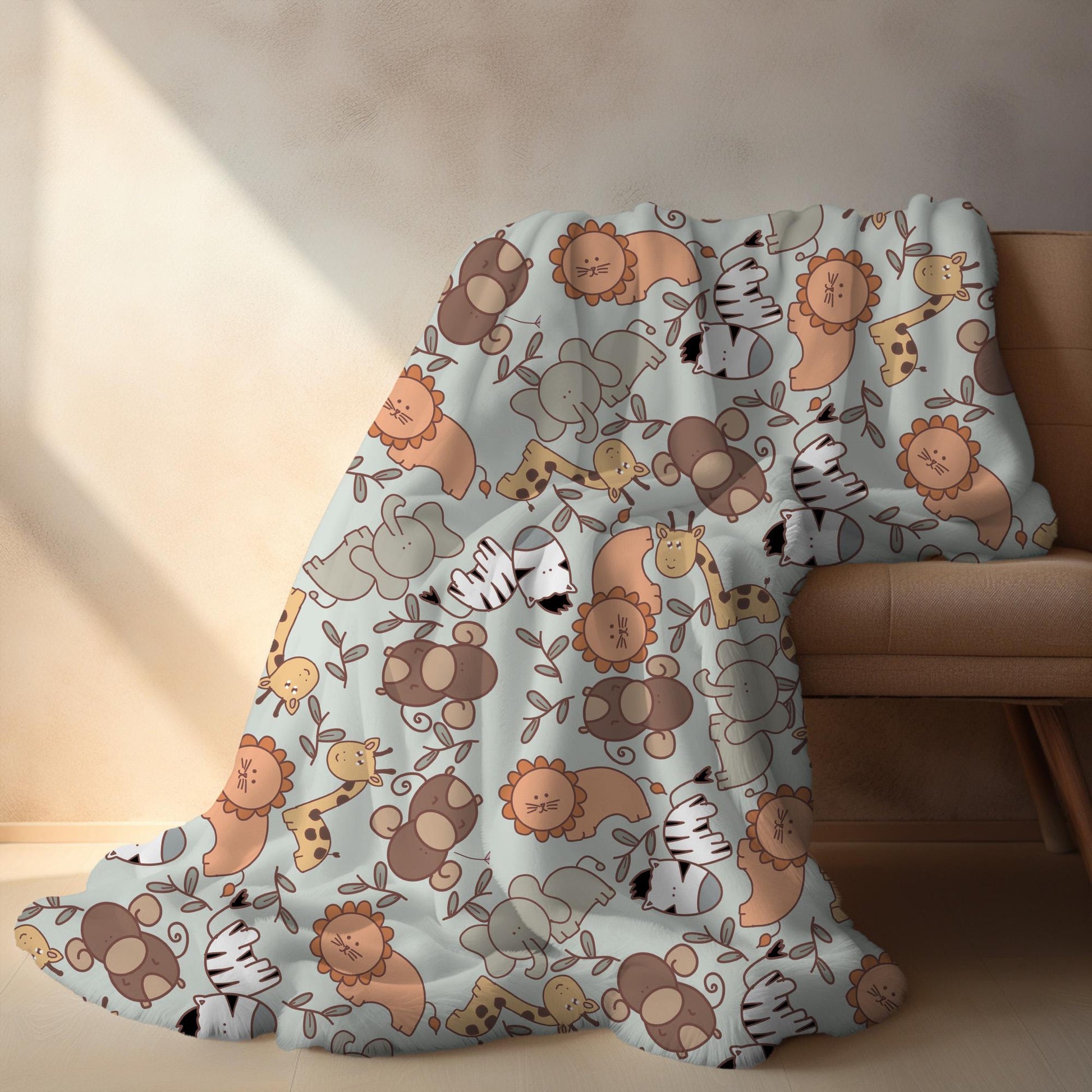 Safari Adventure Design: Cute zoo animals like lions, elephants, and giraffes bring a fun and playful vibe to the blanket.