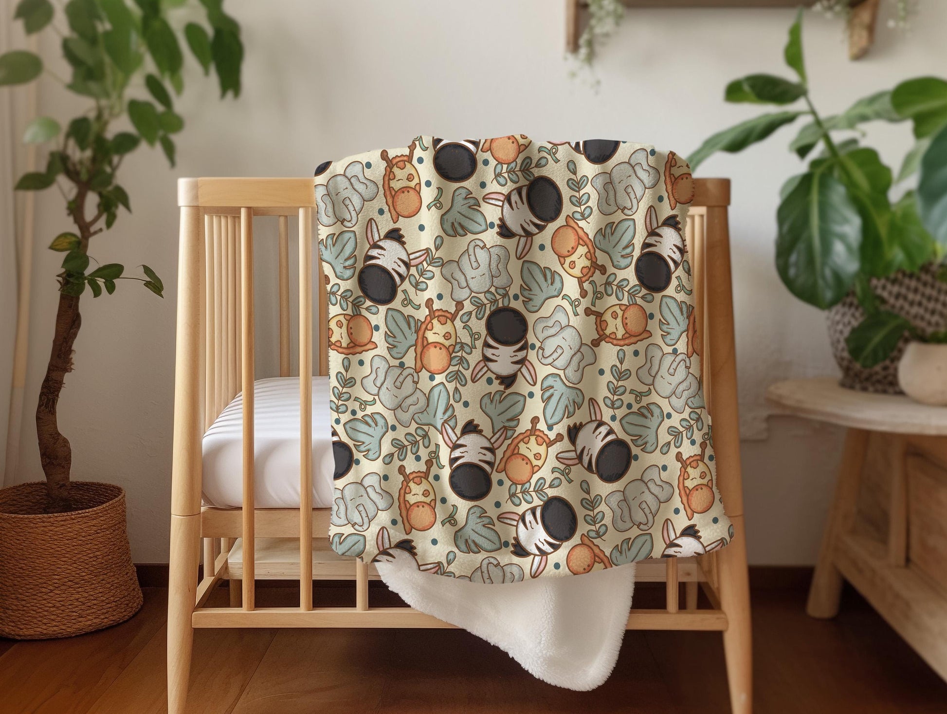 Safari Adventure Design: Cute zoo animals like lions, elephants, and giraffes bring a fun and playful vibe to the blanket.