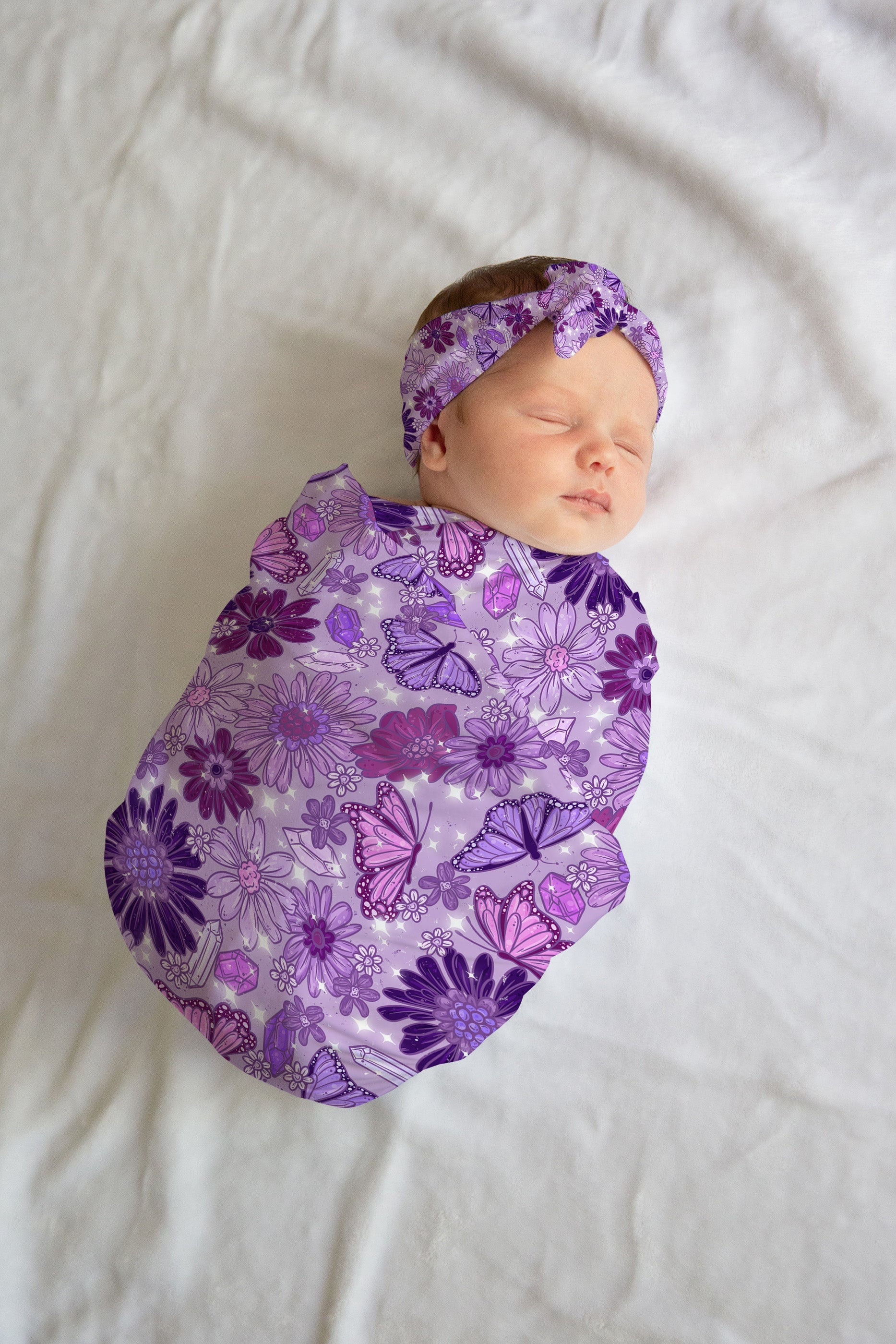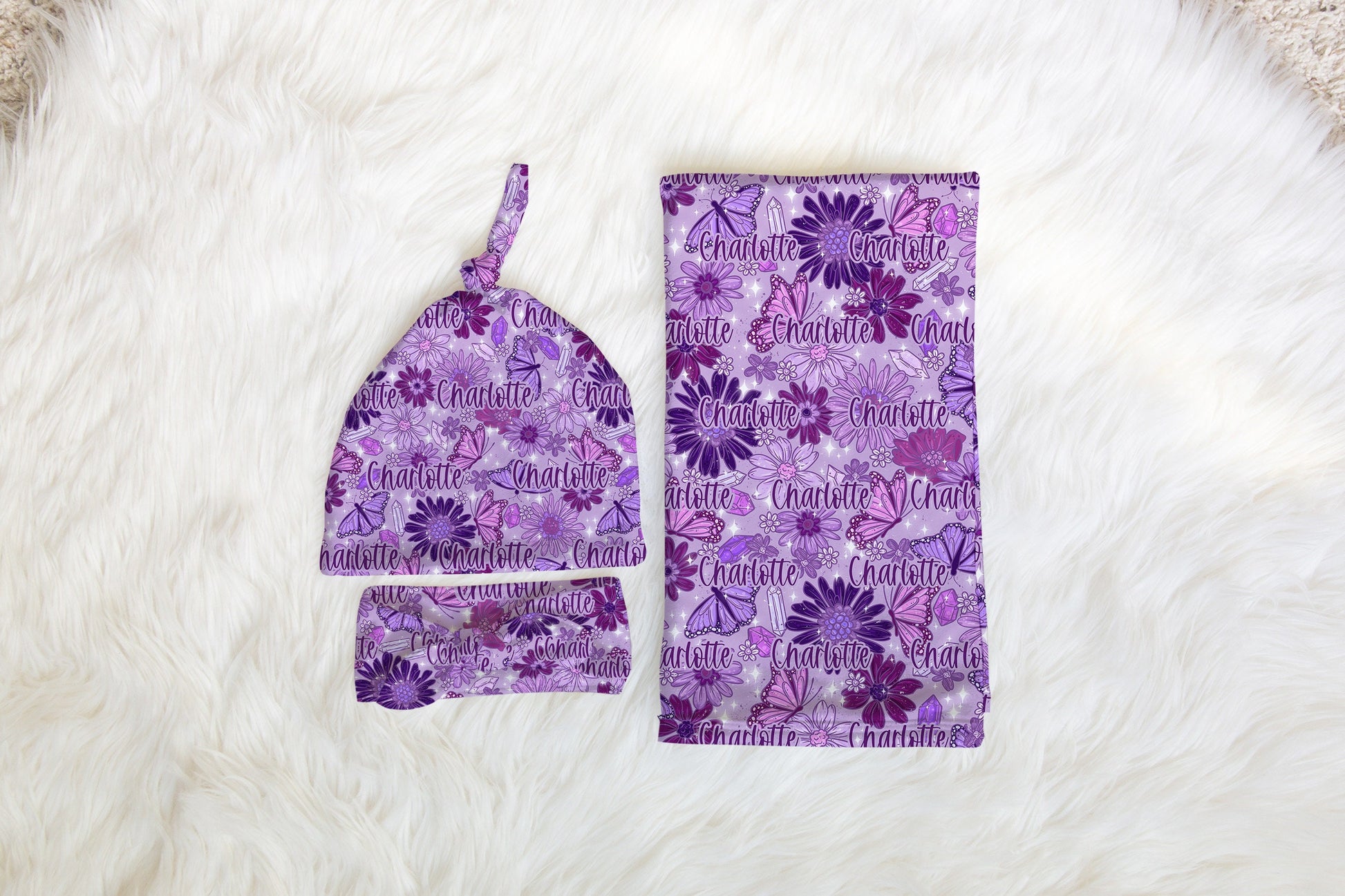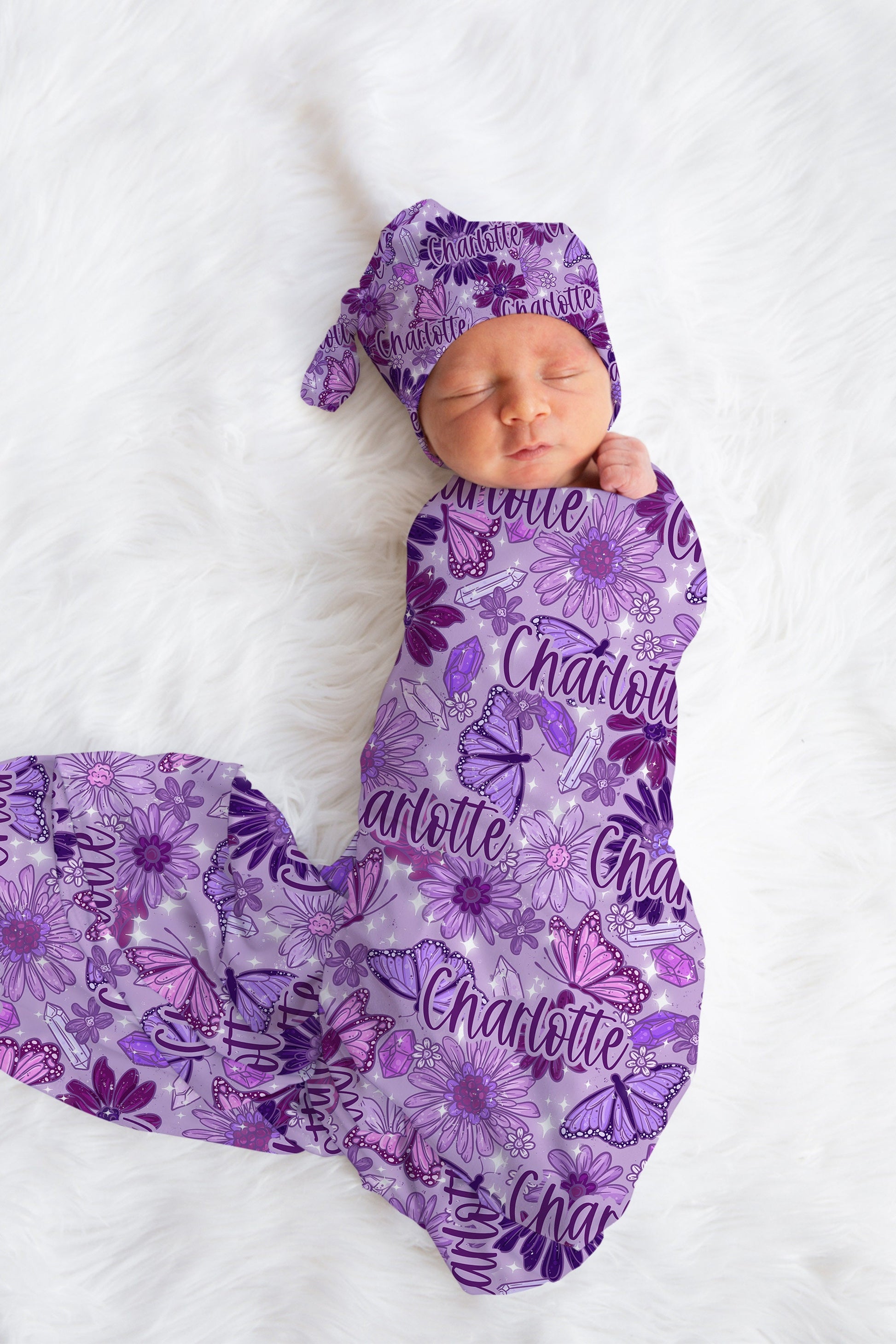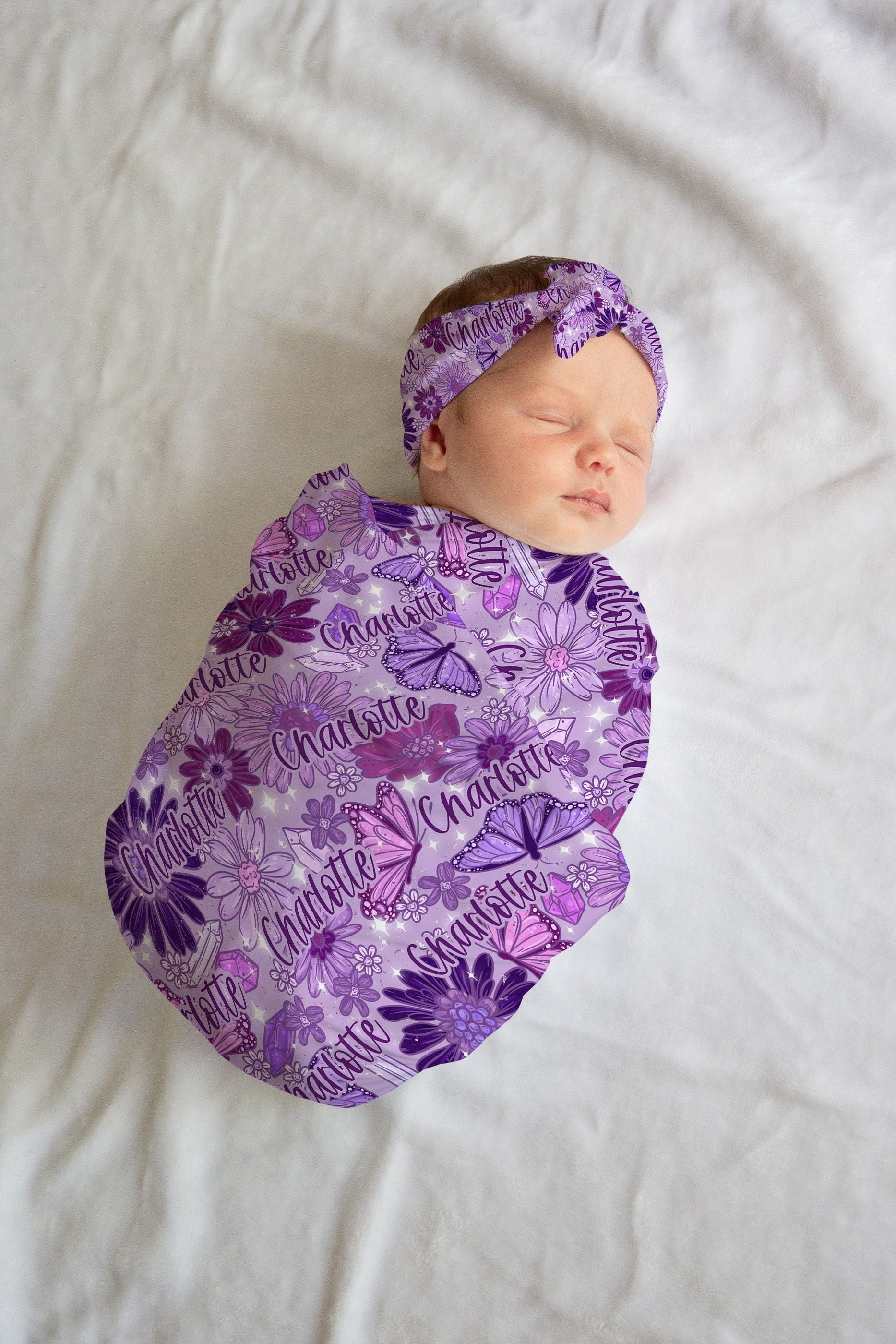 Welcome your little one in style with our Personalized Butterfly Swaddle and Bow Set! This enchanting set features a beautiful purple swaddle blanket adorned with delicate butterflies and a matching bow, perfect for a newborn girl's hospital reveal announcement outfit.
