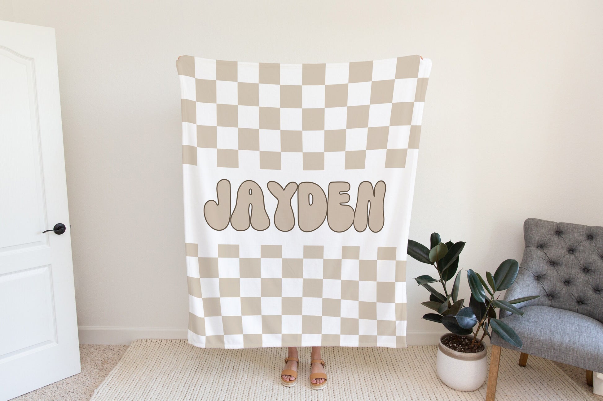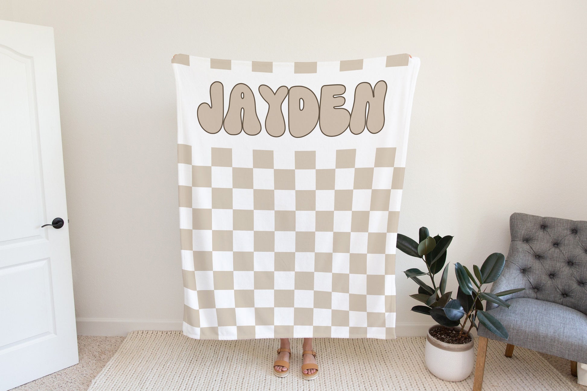 Personalized checkered vintage blanket with Name, Beige Custom blanket gift, Birthday Anniversary Gift, toddler kids blanket