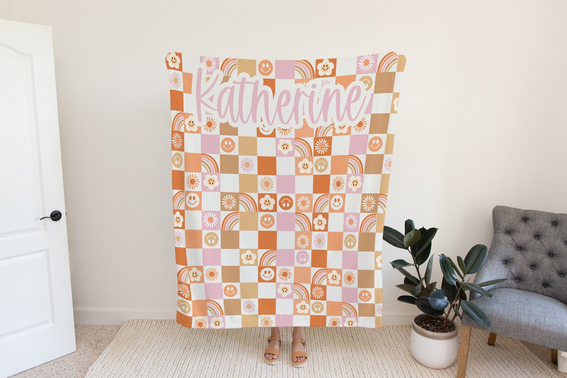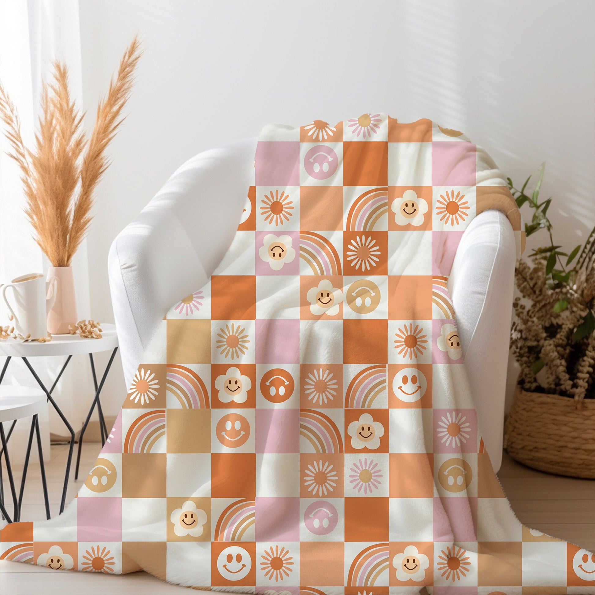 Introducing our Personalized Orange Groovy Checkered Blanket, a vibrant and retro-inspired addition to your home decor. Crafted with soft and cozy material, this checkered throw blanket brings a pop of color and personality to any space.