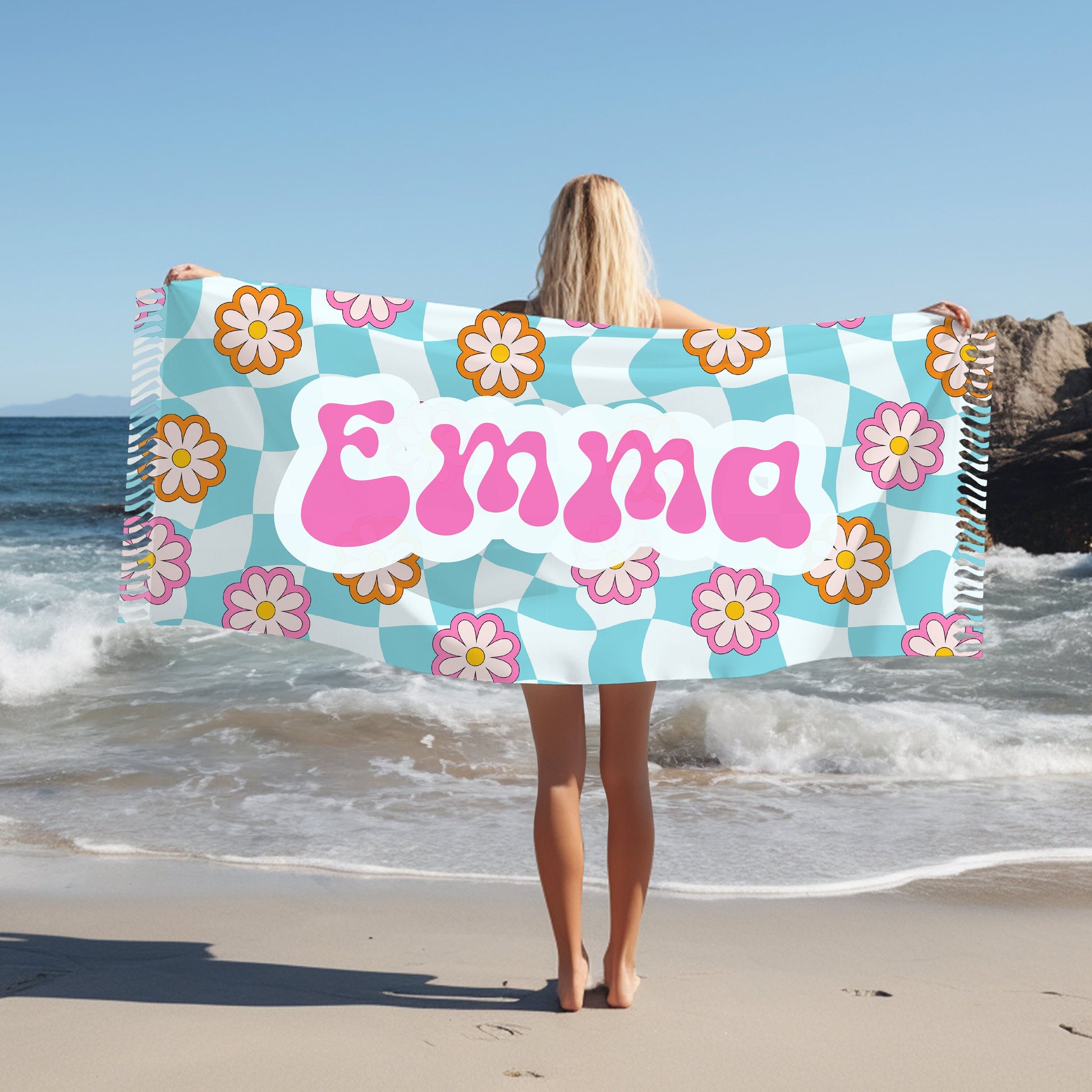 Featuring a trendy combination of pink and blue floral groovy checkered patterns, this beach towel is a visual delight. The personalized touch takes it a step further, making it a unique accessory that stands out on any sandy shore.