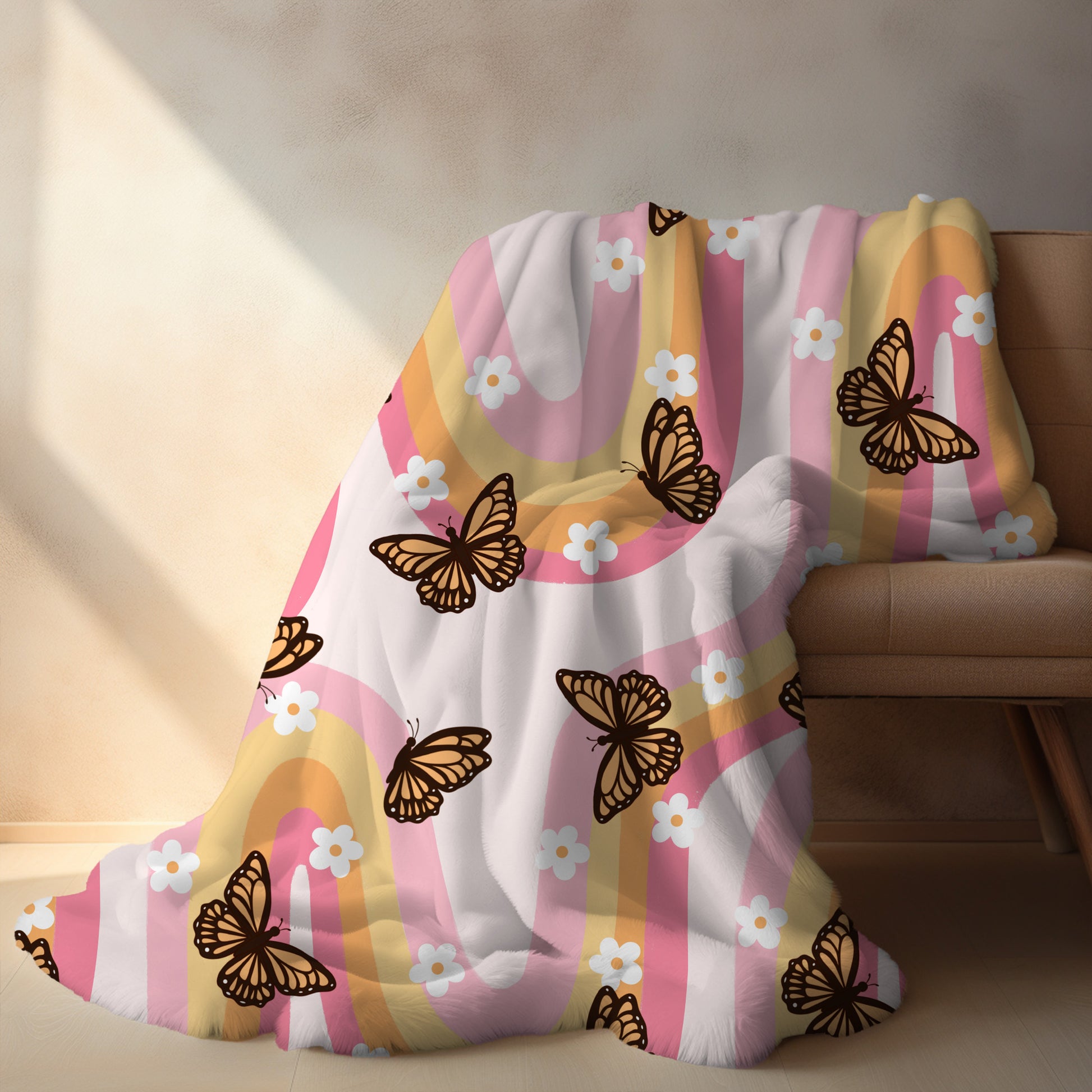 Crafted from high-quality, super-soft materials, this blanket offers both comfort and style. The vibrant butterfly design adds a playful and groovy vibe, making it a standout piece in any room. Personalize it with a name or special message to create a unique and memorable gift.
