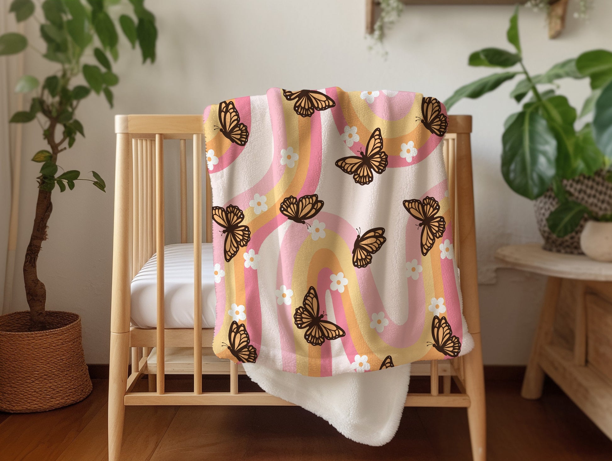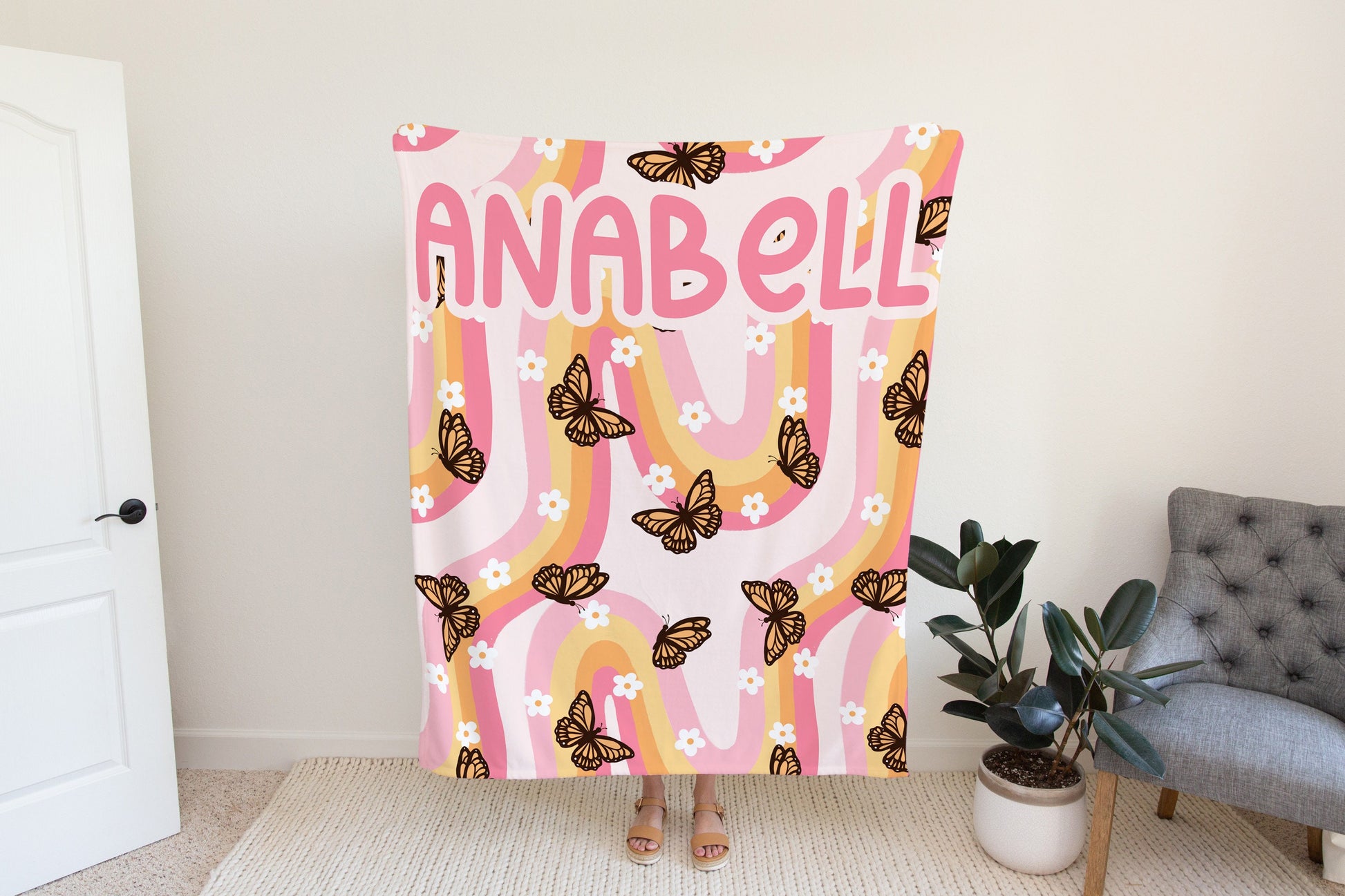 Add a touch of whimsy and warmth to any space with our Personalized Pink Blanket featuring a groovy butterfly design! This charming and cozy blanket makes a perfect housewarming gift for her, a delightful treat for butterfly enthusiasts, or a thoughtful baby shower gift.