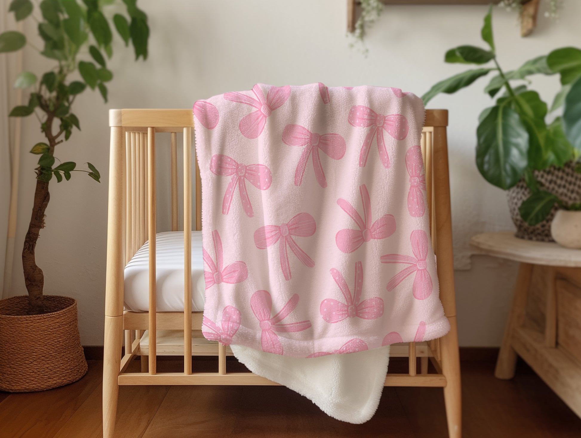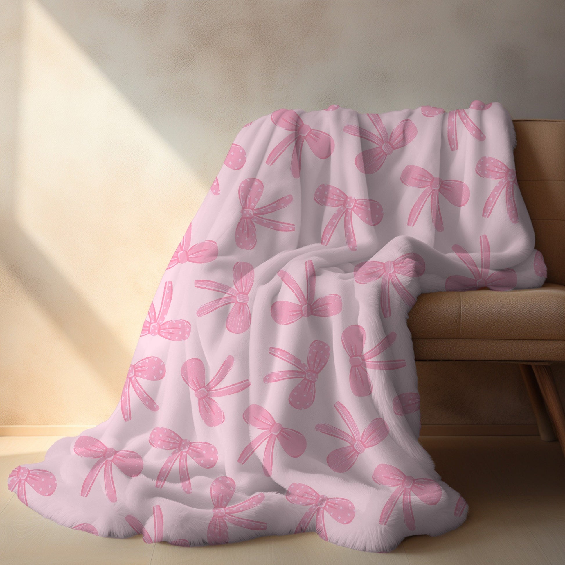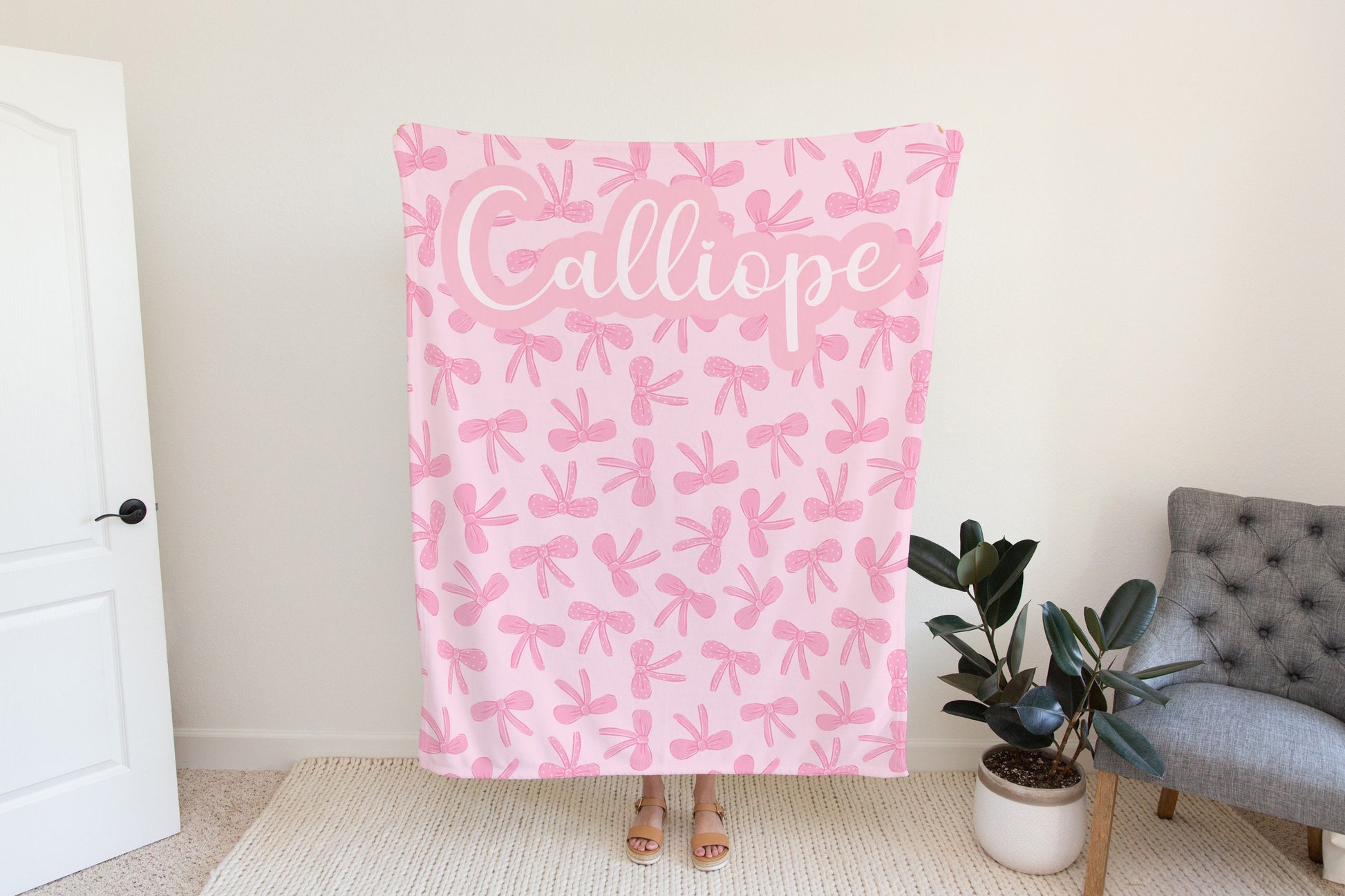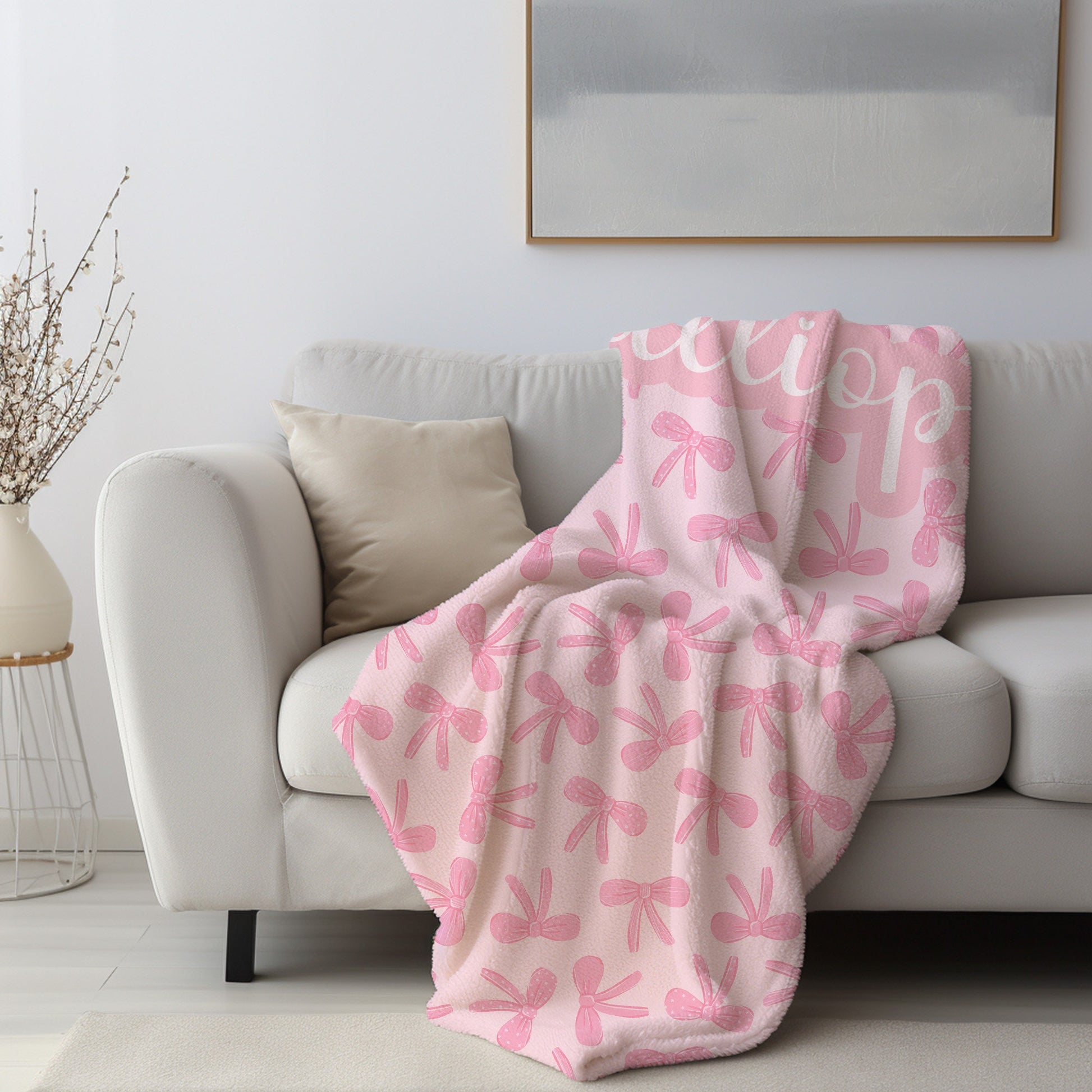 Crafted from ultra-soft, high-quality material, this blanket ensures both warmth and comfort. Personalize it with a name to create a unique and heartfelt keepsake, making it a wonderful gift for any occasion. Whether it’s for a preppy dorm room, a chic living space, or as a special gift, this pink bow throw adds a sophisticated touch to any setting.