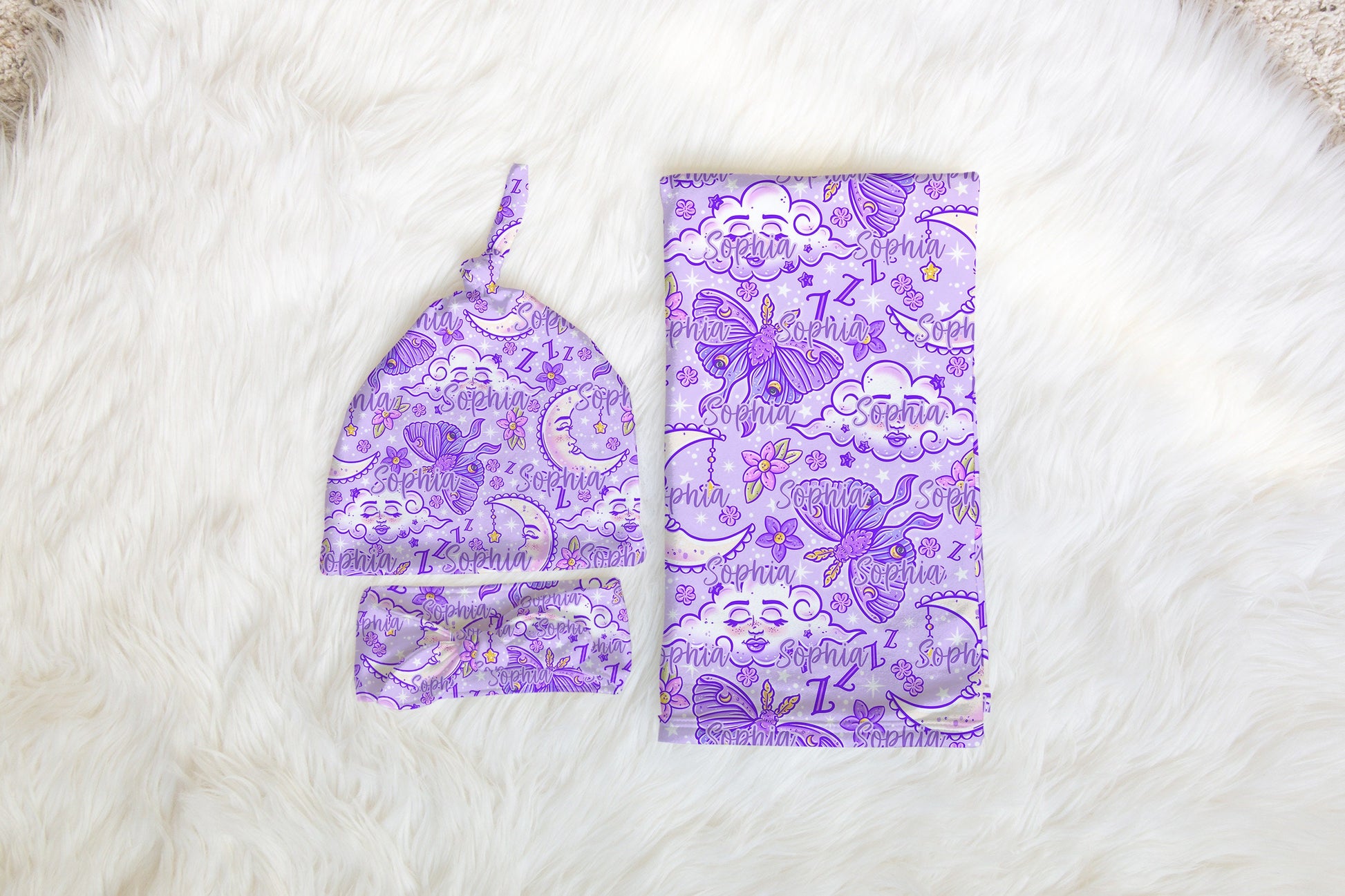 Personalized Purple Swaddle Set Bow Hat Baby Blanket