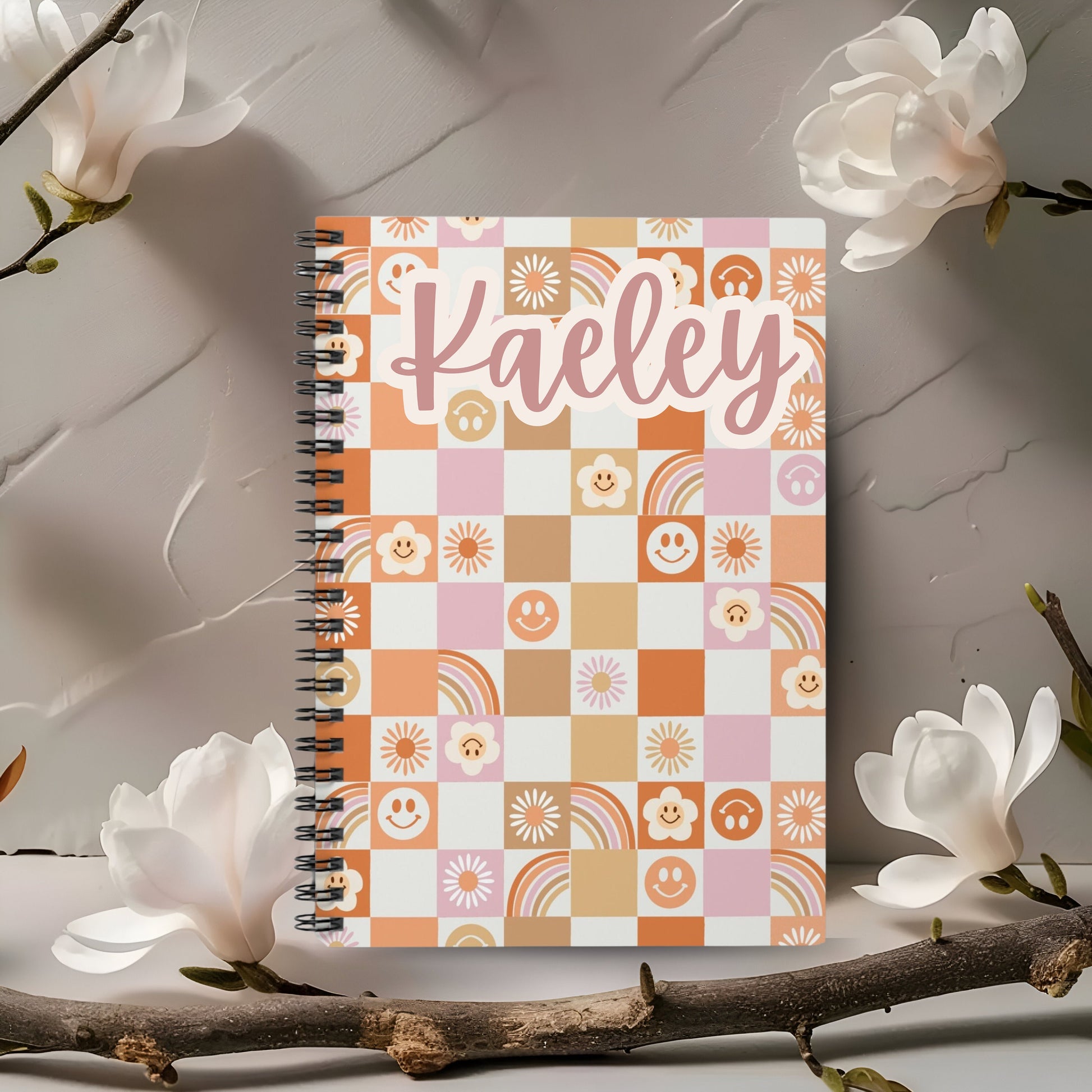 Capture your thoughts in groovy style with our Personalized Retro Notebook, a vibrant homage to the funky designs of the 70s. Featuring a checkered spiral design and cheerful smiley faces, this notebook exudes retro charm.