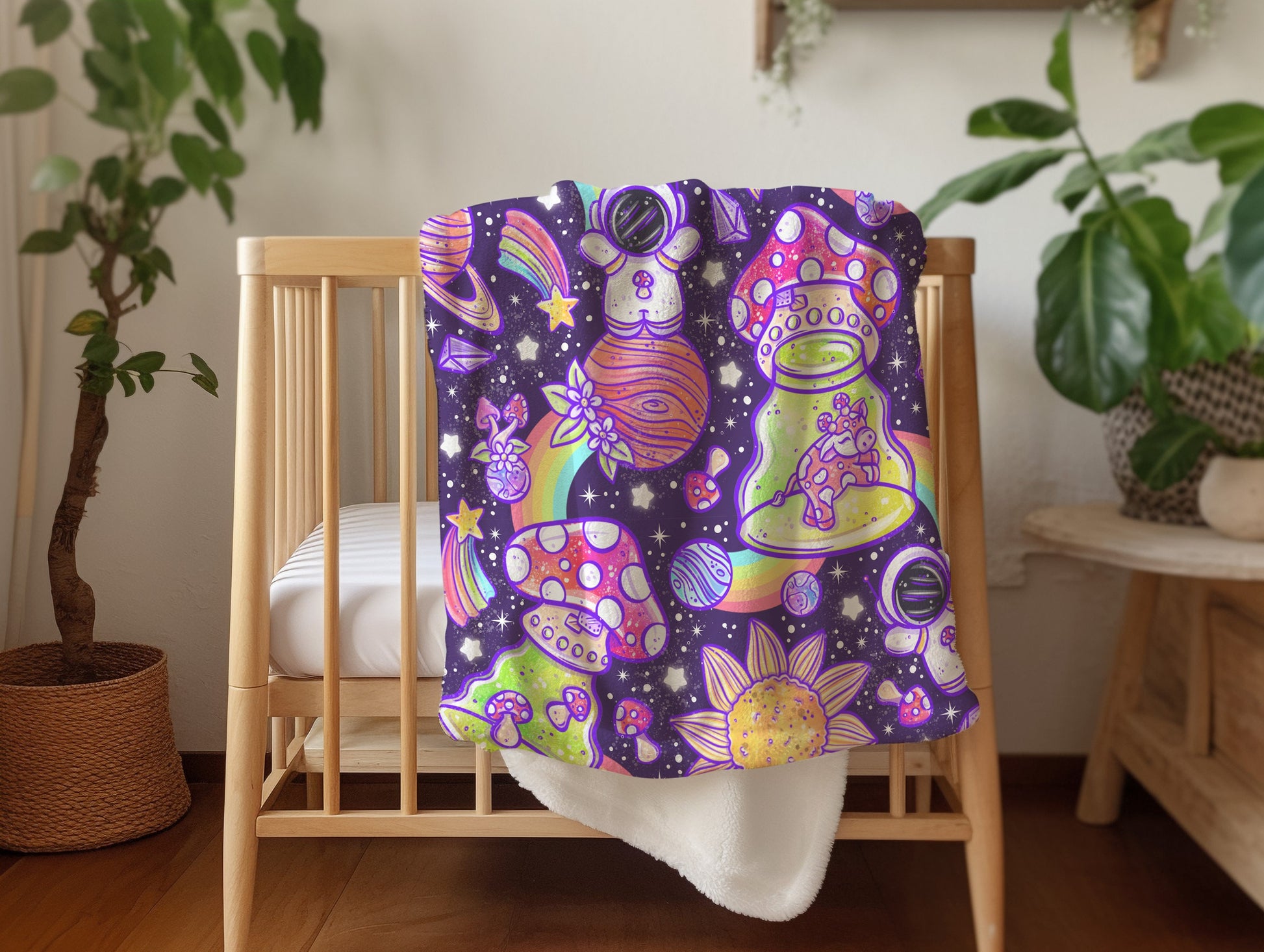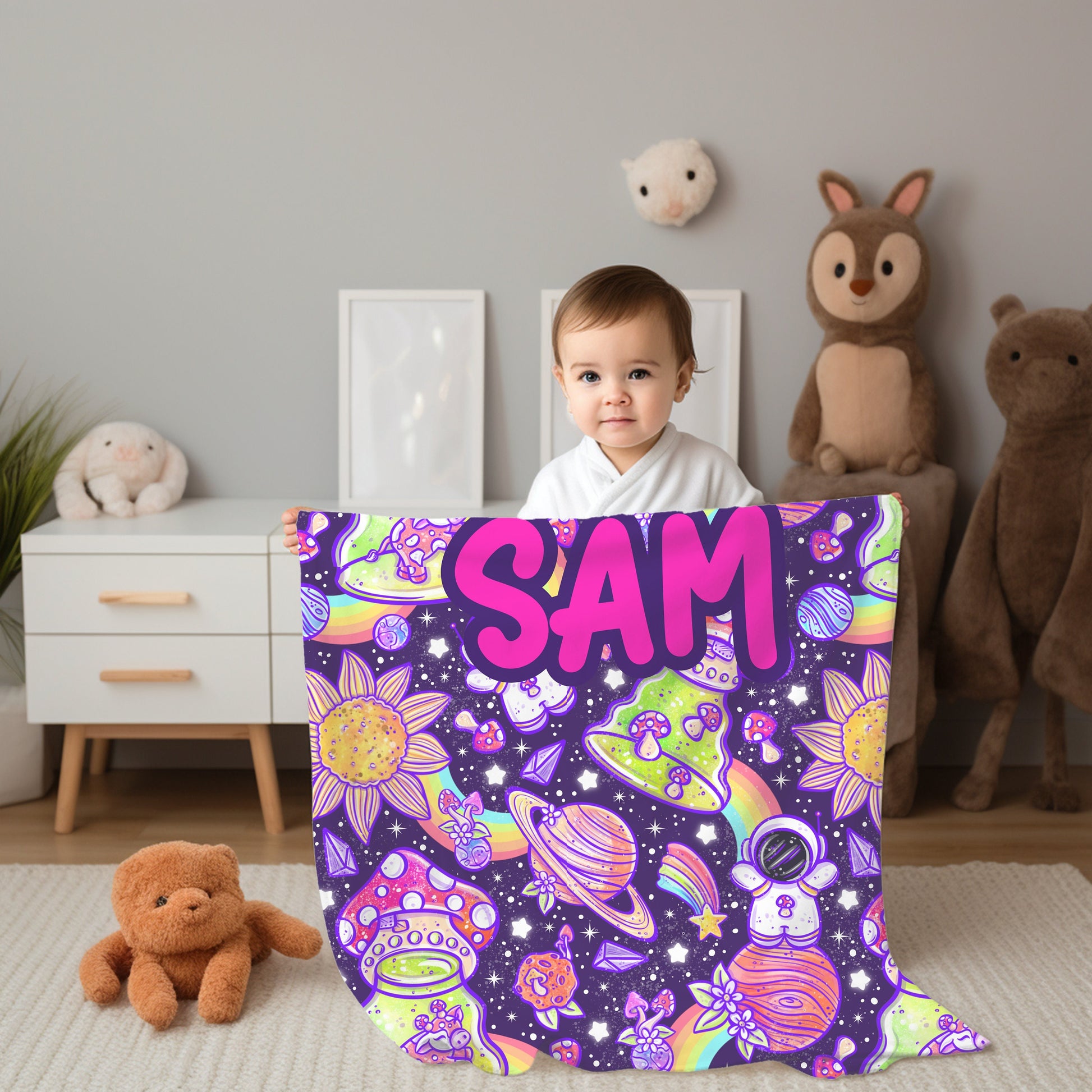 Featuring a charming space-themed design, this blanket can be personalized with any name, making it a unique and thoughtful gift for baby showers, birthdays, or housewarming celebrations. The vibrant colors and whimsical illustrations of stars, planets, and rockets will captivate young imaginations and add a touch of wonder to any nursery or living room.