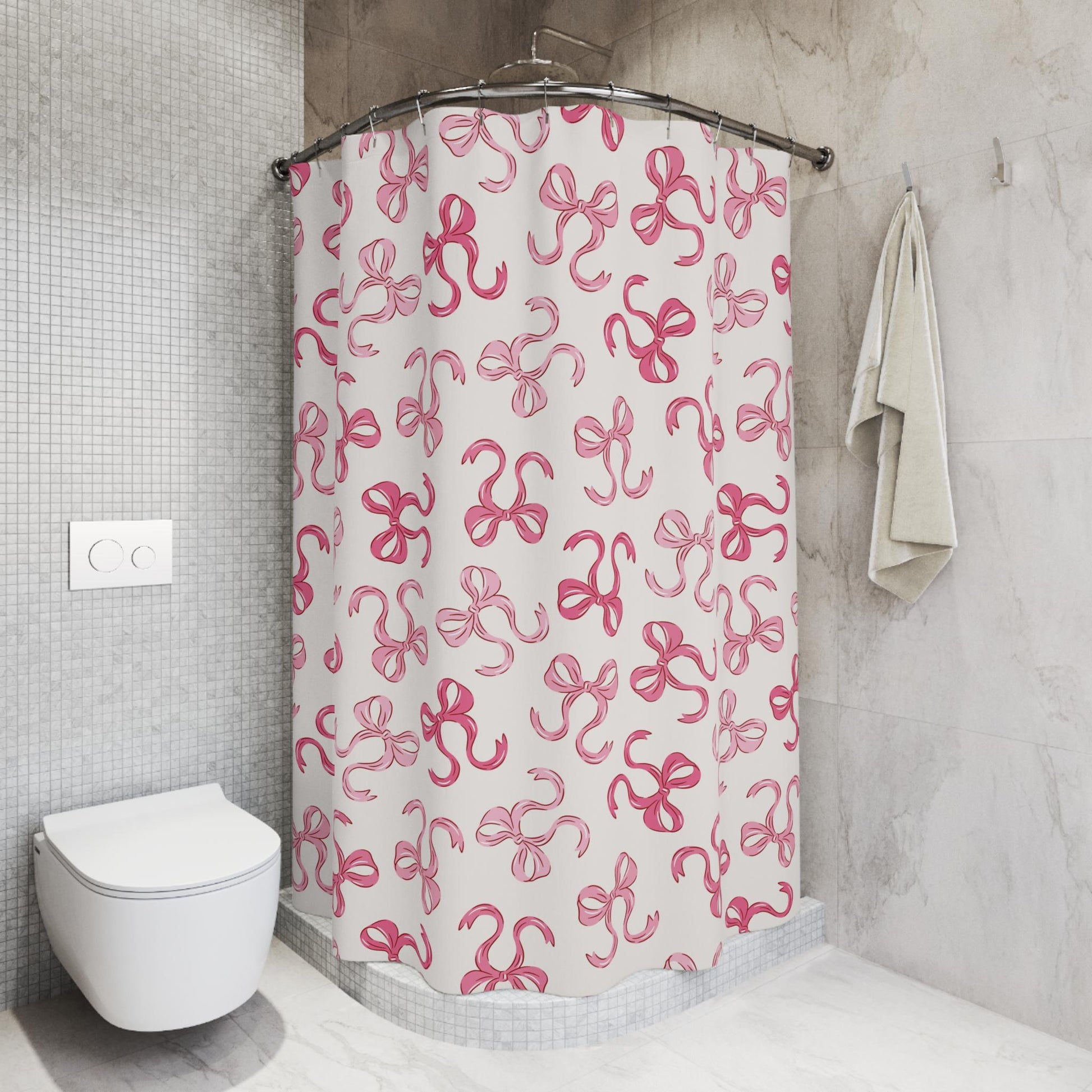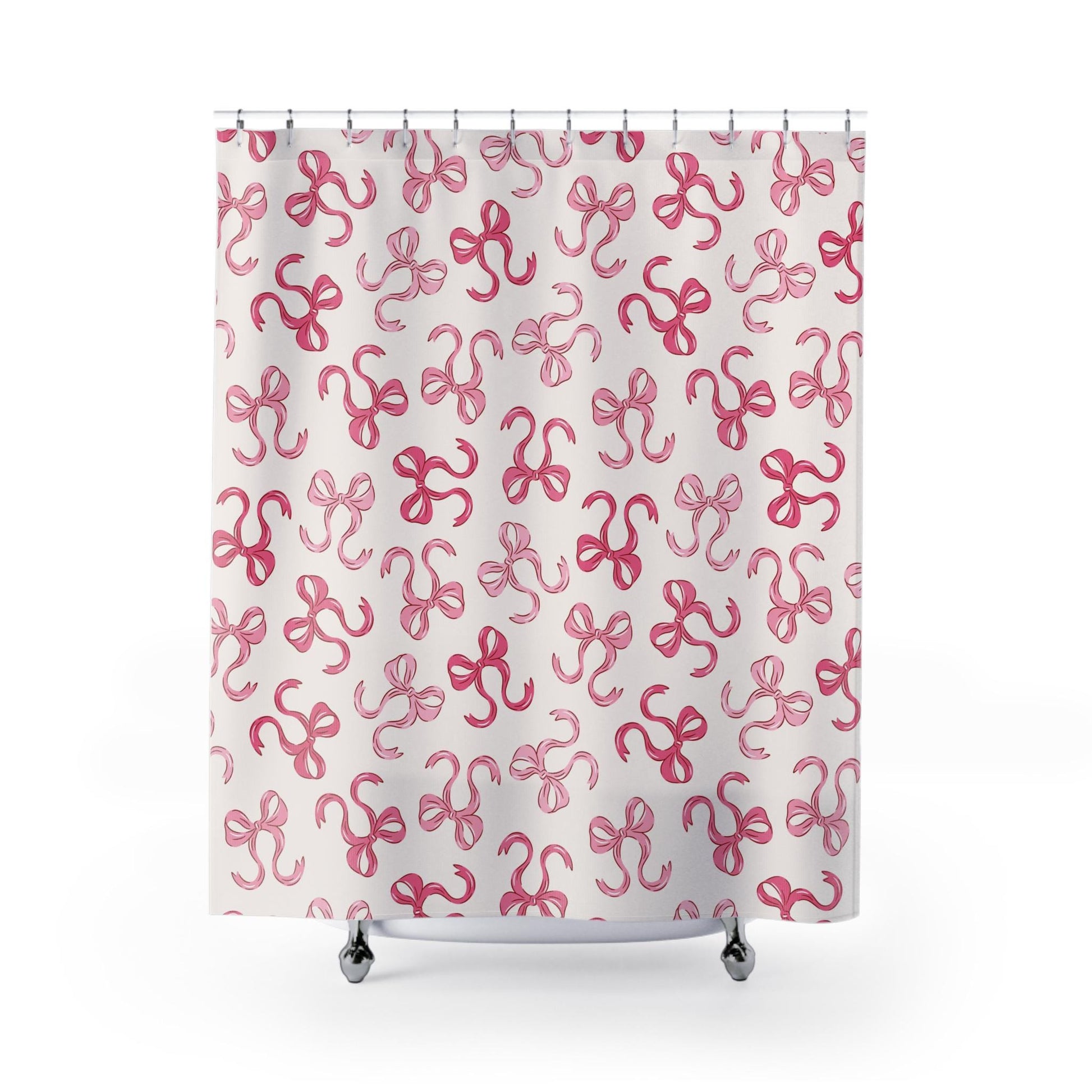 Elevate your bathroom decor with this adorable yet sophisticated pink bow shower curtain! A must-have for any preppy or coquette-inspired home!