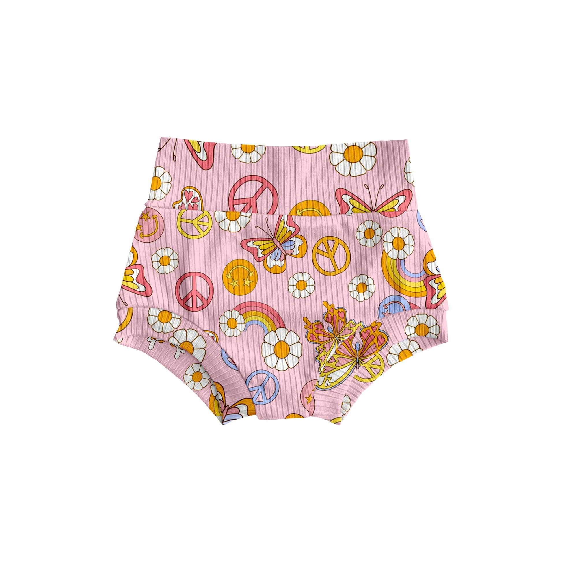 Ideal for everyday wear or special occasions, our Pink Groovy Ribbed Bummie Shorts are a must-have for any little fashionista's wardrobe. Let your little one embrace their inner hippie and spread positivity wherever they go with these adorable retro shorts.