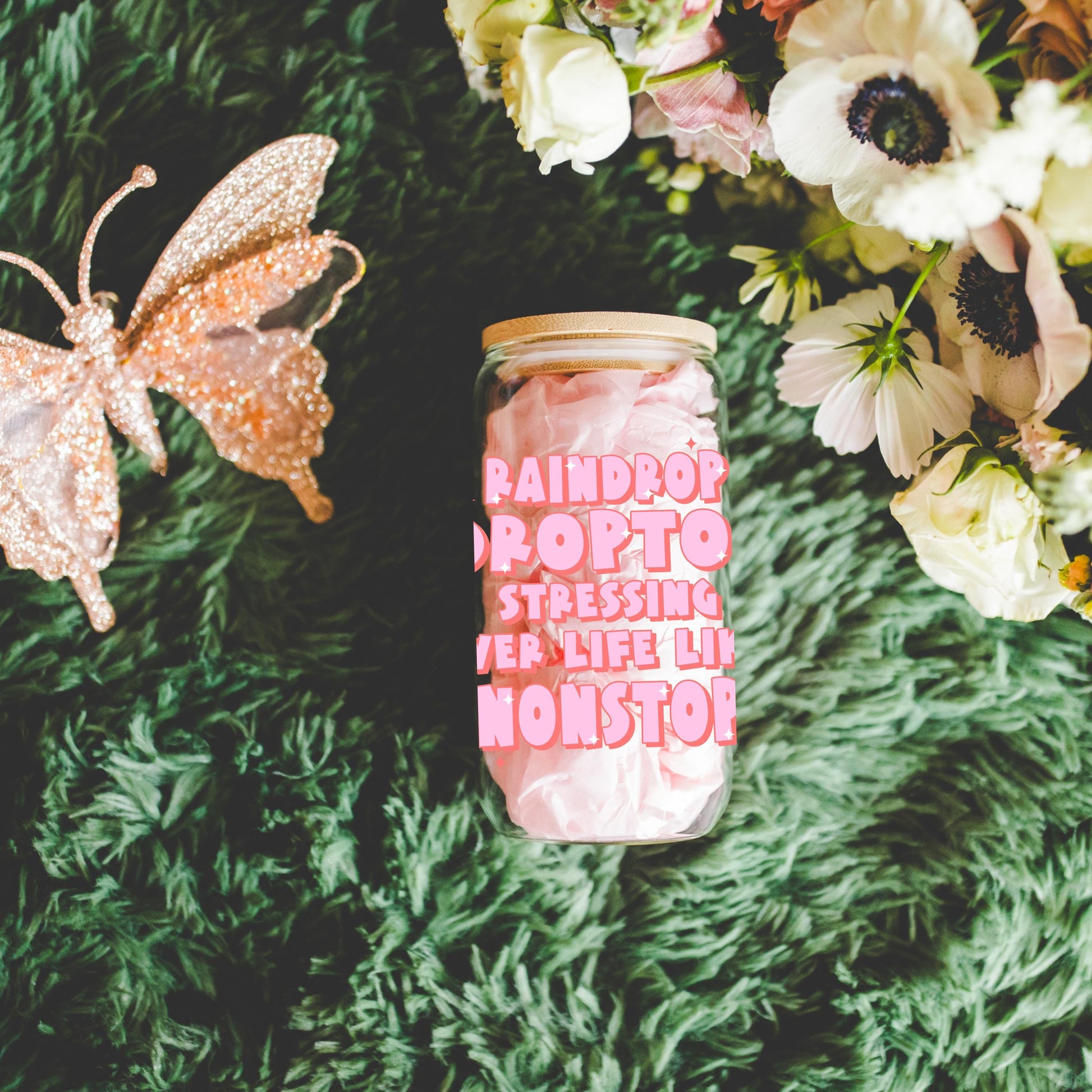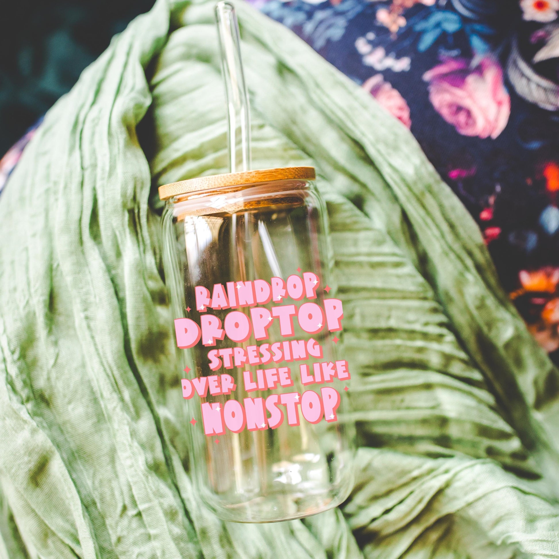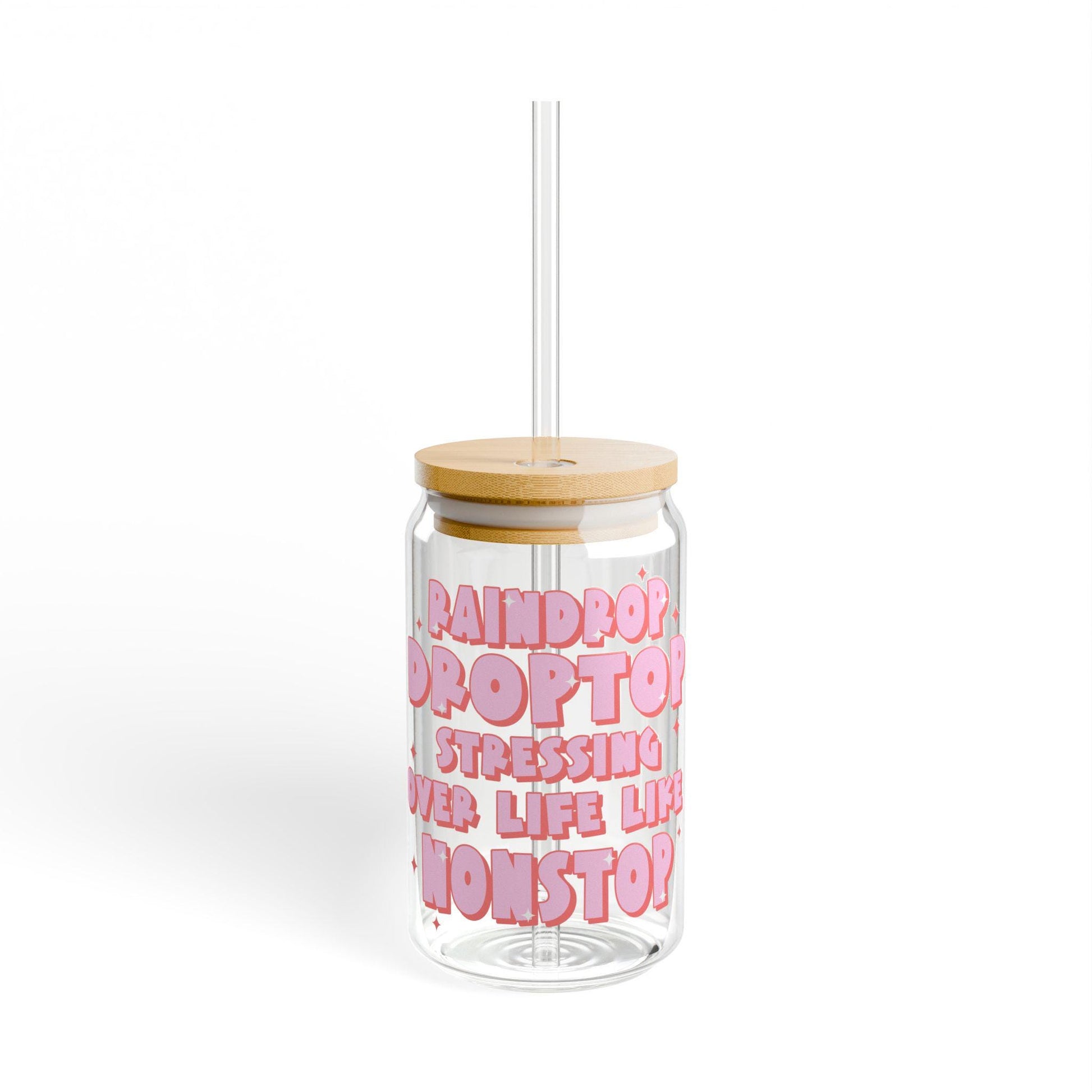 Preppy funny glass cup with bamboo lid glass straw, Cute Cup Beer Can Iced Coffee Glass Cup Cute stress Glass Cup gift for her