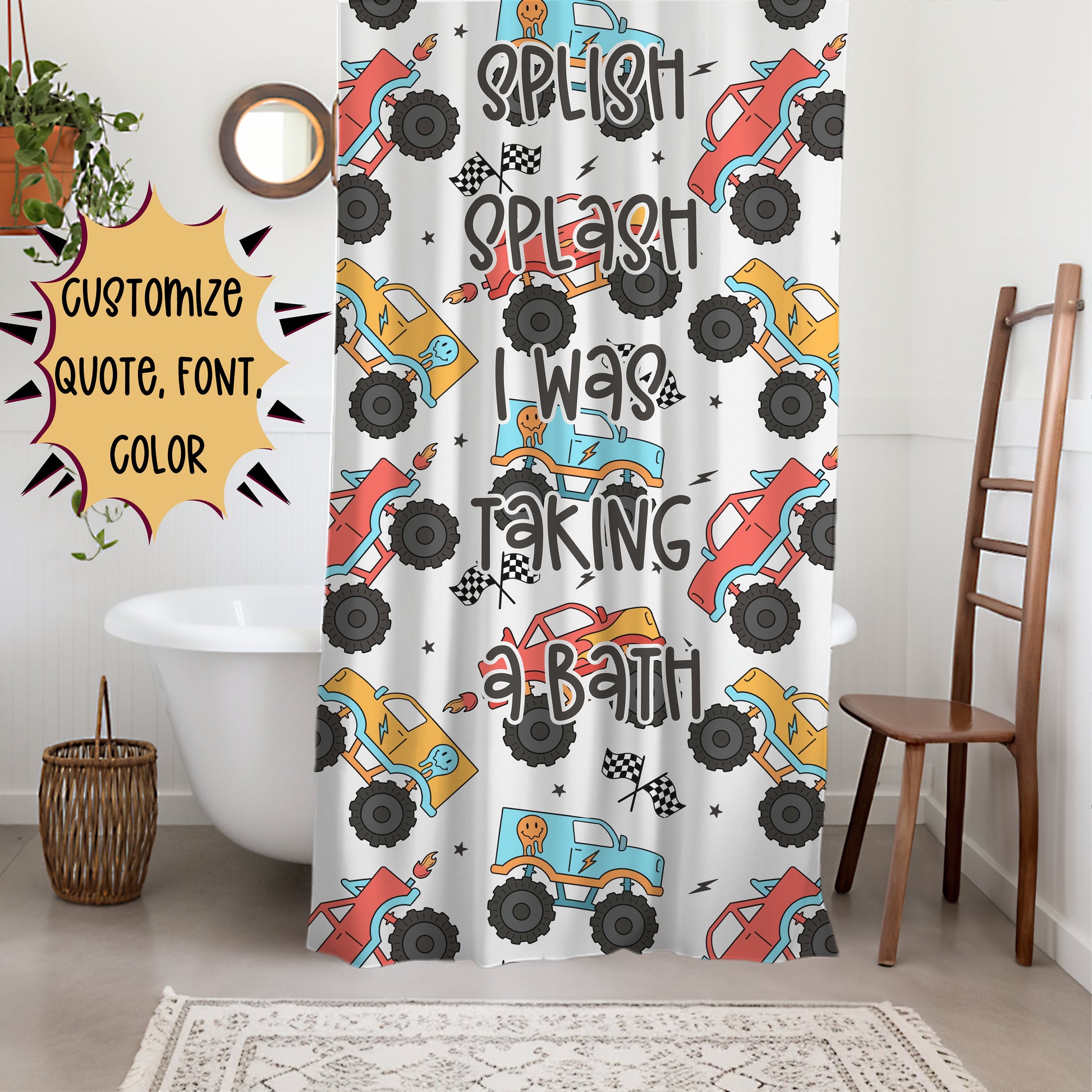 Transform your child's bathroom into a fun and vibrant space with our Personalized Boys Shower Curtain featuring a playful truck design. This custom shower curtain is perfect for boys who love trucks and will add a delightful touch to their bathroom decor.