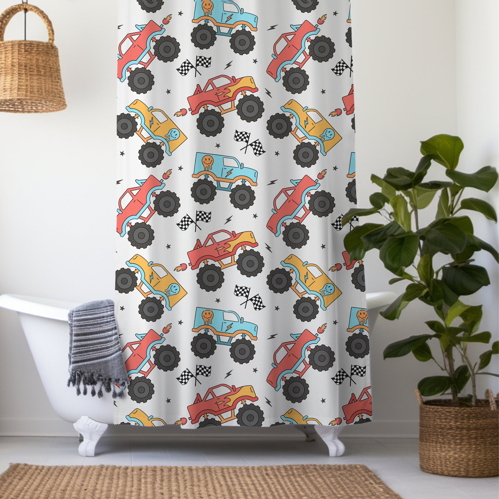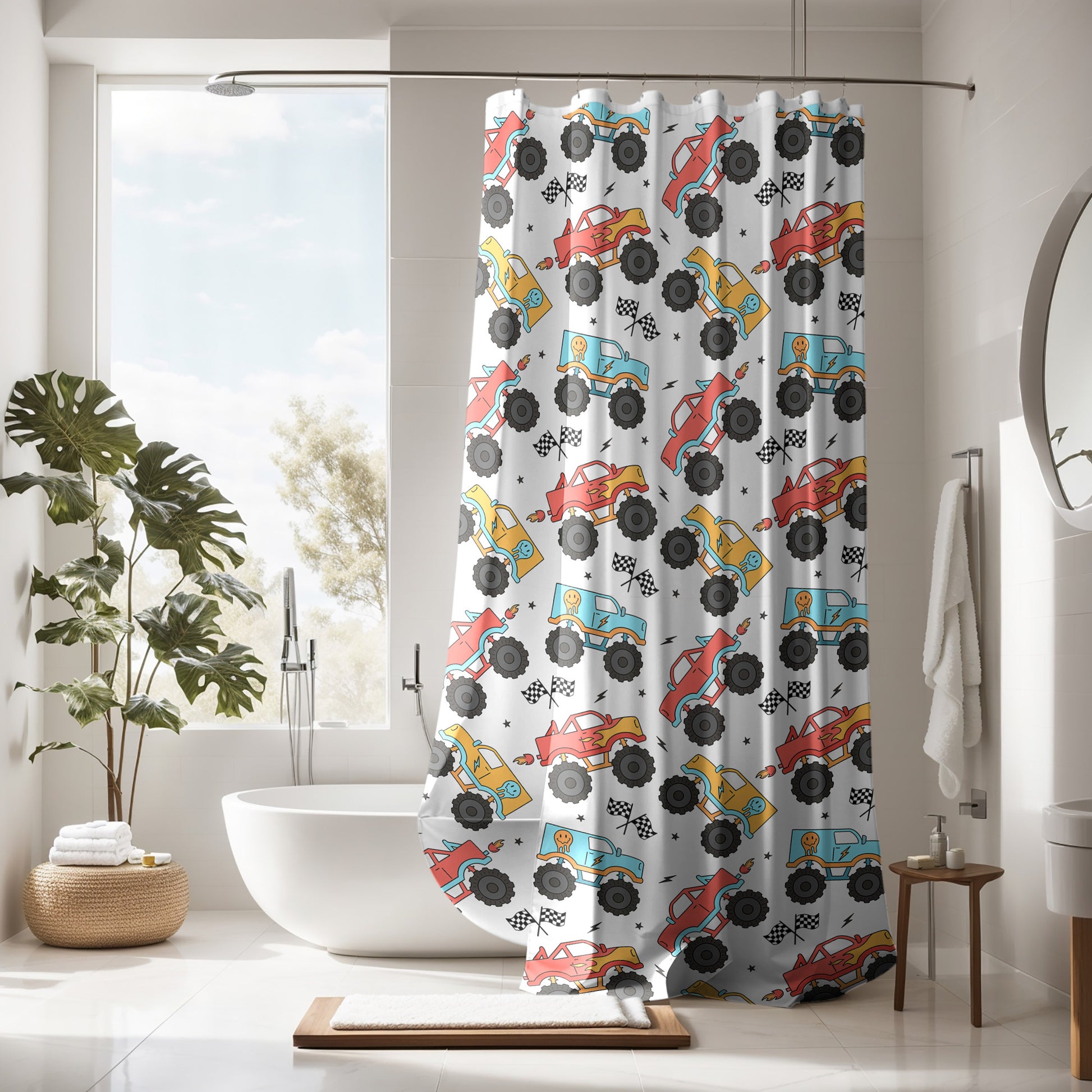 The colorful truck pattern is sure to spark their imagination and make every shower an adventure. Ideal for kids' bathrooms, this custom shower curtain is not only functional but also a fantastic way to personalize their space.
