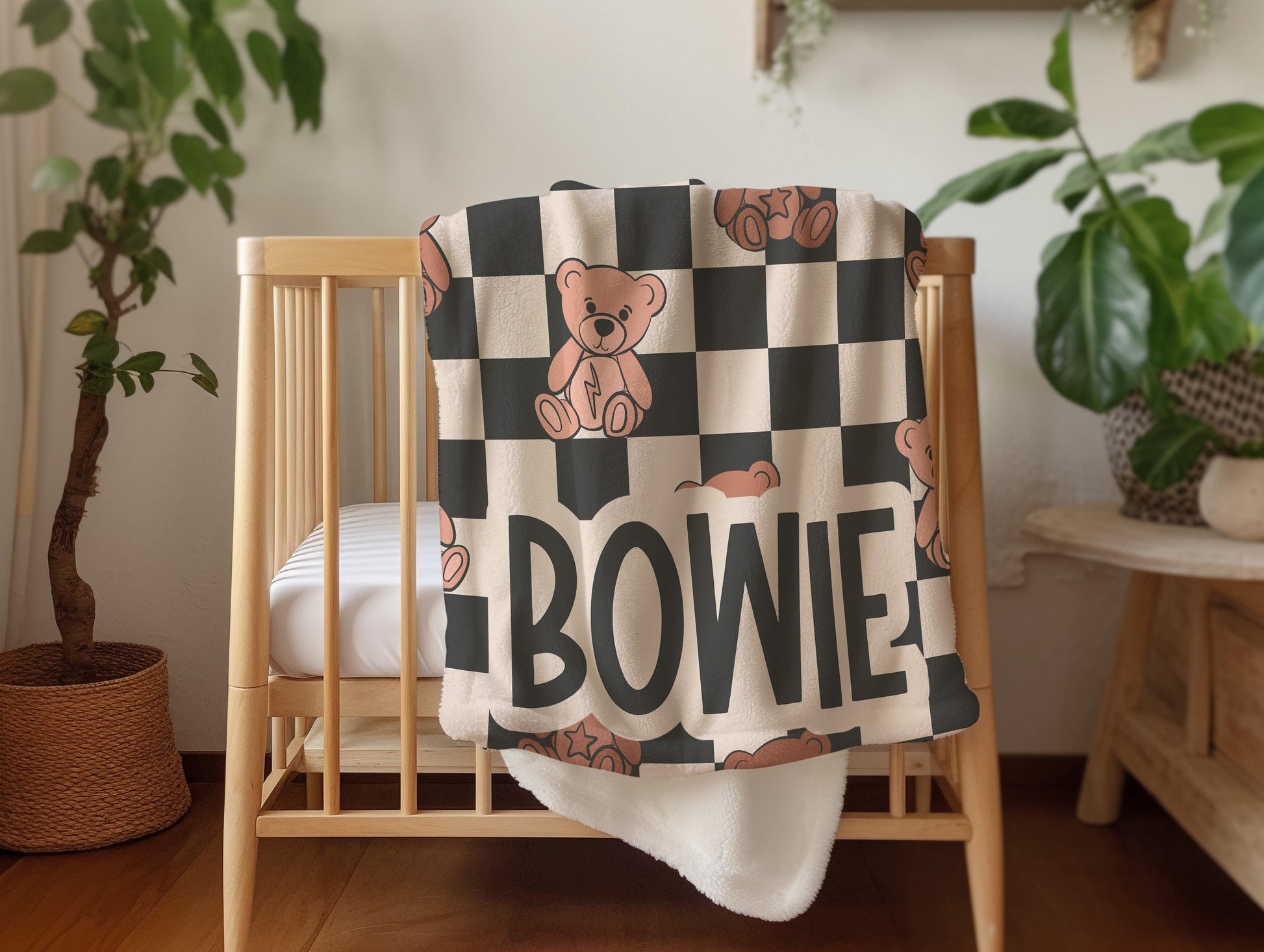 Teddy bear blanket for boys checkered, personalized blanket custom name, birthday gift for him, custom name baby blanket, baby shower gift