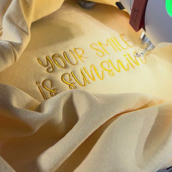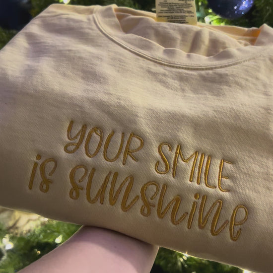 Brighten someone's day with this cheerful embroidered sweater or tee! Featuring the uplifting message "Your Smile Is Sunshine," it's the perfect feel-good piece for spreading positivity. Whether you're layering it up or keeping it casual, this cozy garment combines comfort with an inspiring reminder that happiness looks good on everyone. A wearable dose of joy for any occasion.